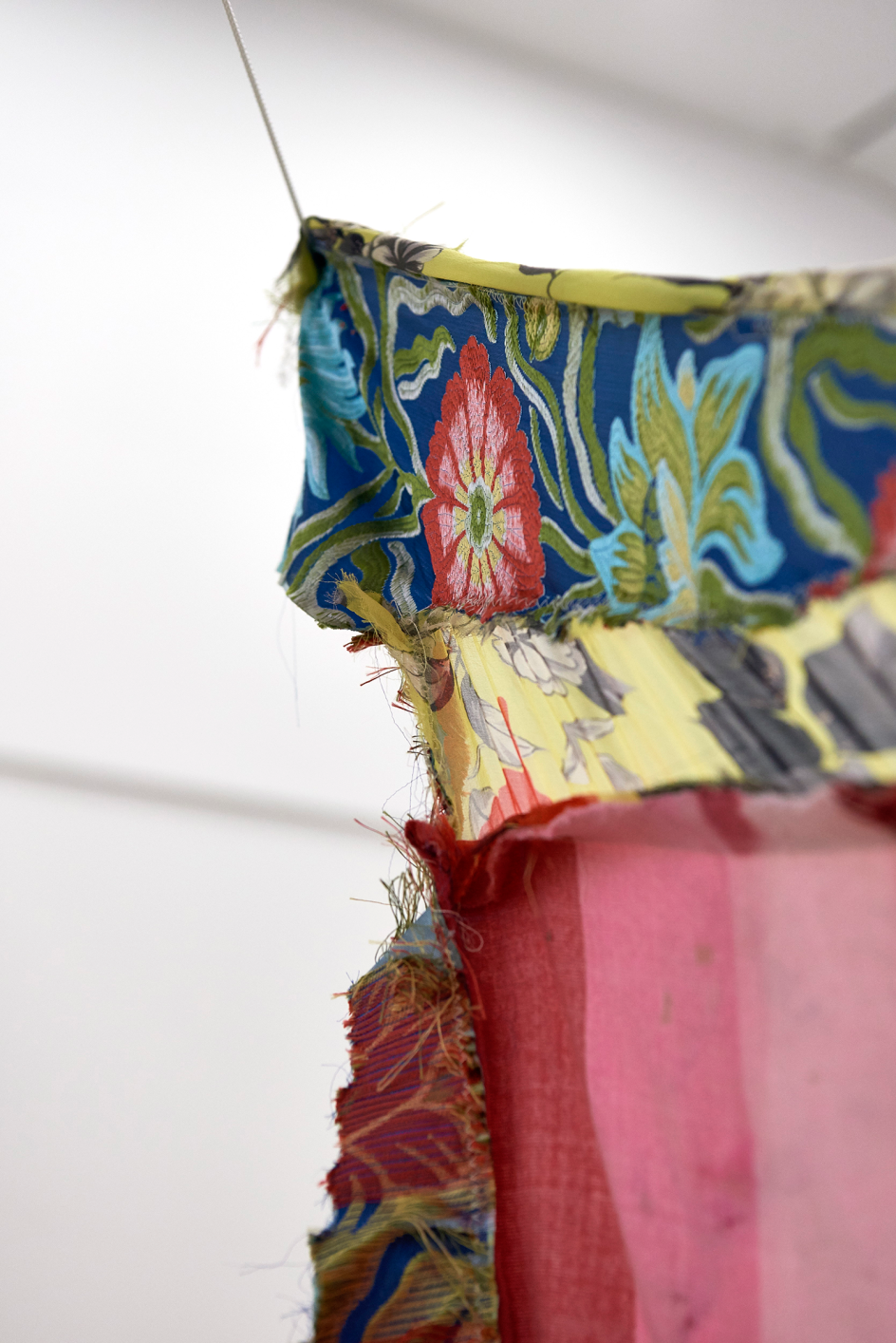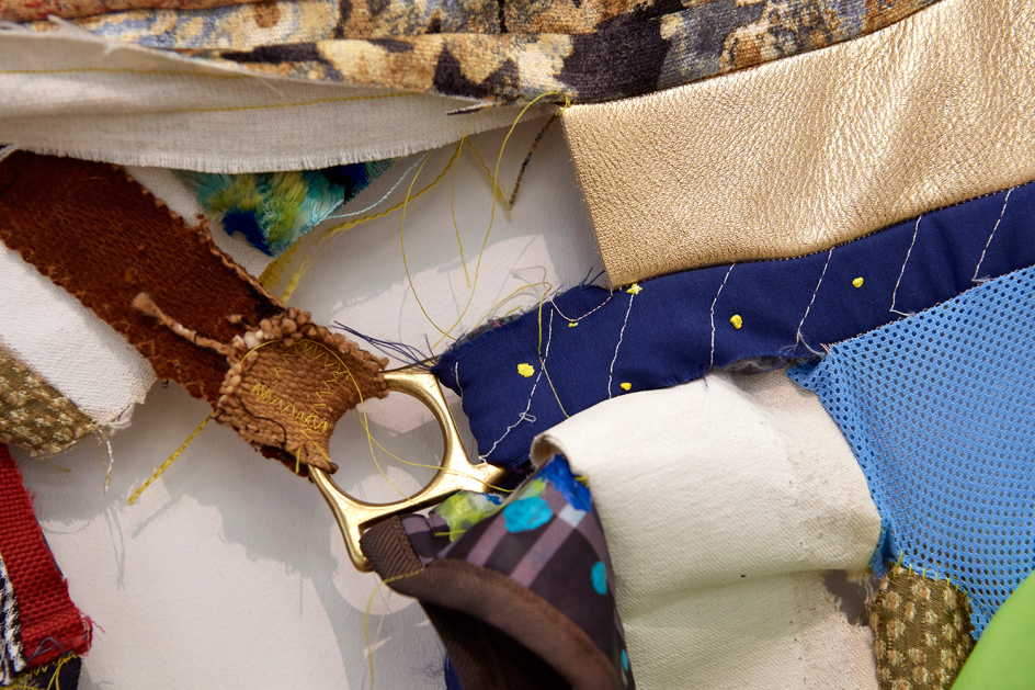 His works are formed from a melange of blankets collaged with found fragments of magazines, paper, textiles and worn clothes. According to the gallery, his use of quilted moving blankets, that are "used to project objects in transit", reference ideas around domesticity that hint at the nomadic nature of his life as an artist.