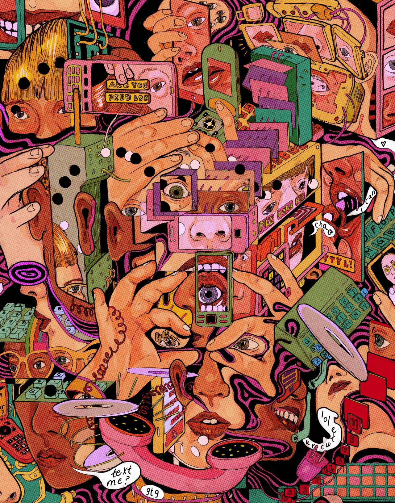 In Eva's illustrations, heads unfurl like orange peels to reveal innermost thoughts, and external elements of modern life collide to create a sensory explosion. These frequently allude to pertinent subjects such as mental health and the condition of the planet. "I also include a lot of imagery and architecture from New England, because it's where I grew up.