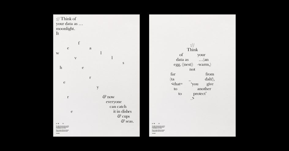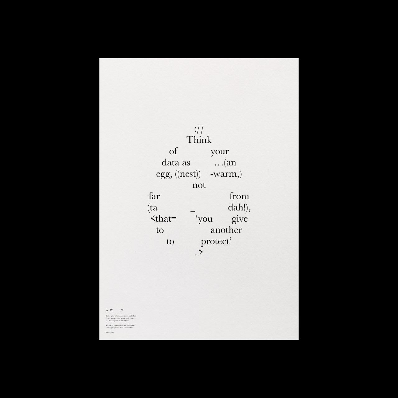AWO works as a data rights law and consulting agency, and according to Accept & Proceed its identity looks to exemplify the brand's "mission to support innovation and the responsible use of data." The name's reference to Brautigan's poem aims to underscore AWO's drive to "defend and extend human rights" through a combination of data, technology, law and policy.