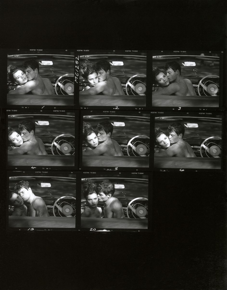 Steven Meisel’s photograph, Linda in Library, is indicative to the rise of the supermodel in this era, and Tony McGee’s shot of Kate Moss in a car from 1988, shows a distance from traditional studio photography. This early shot of Moss was taken shortly after she was discovered by Sarah Doukas of Storm and sent to McGee’s studio. McGee decided it would be a great idea to photograph her with a young boxer he was shooting in the Mercedes he had bought from David Hockney. The contact sheet for this photograph will be shown alongside the final image.