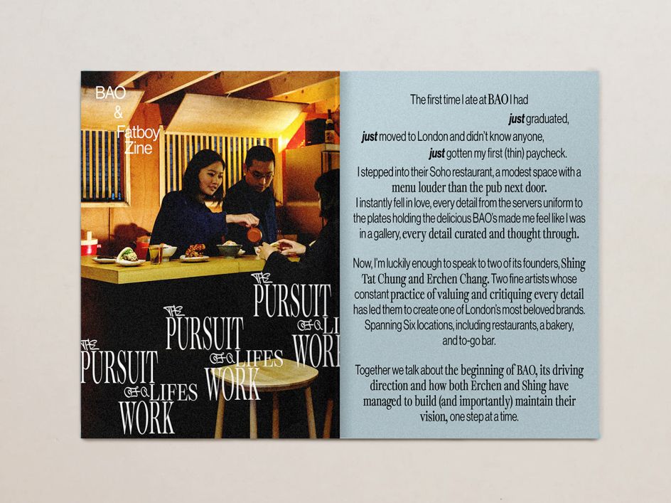 As for the art direction, Chris reveals that the core visual influence for FatBoy Zine is Asian food packaging: "the colours and typography are just an endless source of joy to look at". Fancy and low-key restaurants are another source of inspiration, as he loves the scene of a table after everyone has eaten. "It's messy, colourful and just abstract as hell! And weirdly, I'm inspired by the Fluxus art movement. I love the playfulness and attention to how people interact with art, not just the art itself."
