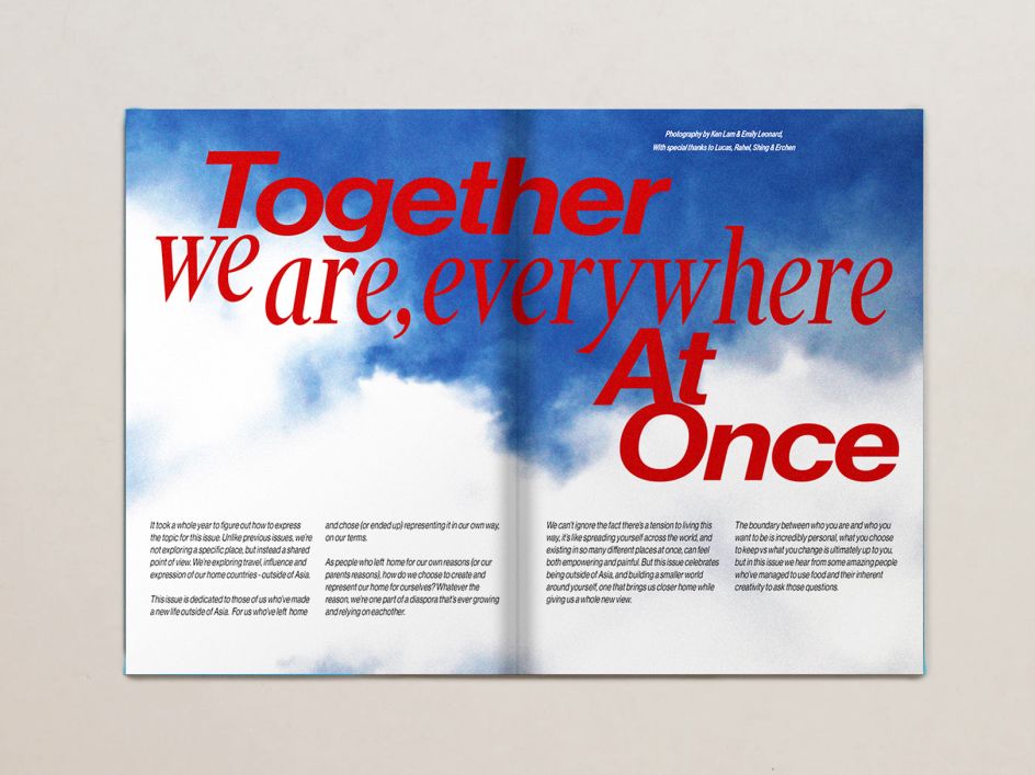 "It doesn't have to be specific or even agreeable to your perspective," he adds. "But you know they'll bring a big portion of themselves to the theme, and that's more important. Also, I feel like the Asian community, whether it's in food or creative, is so supportive and wants to collaborate. It makes it easy reaching out to people."