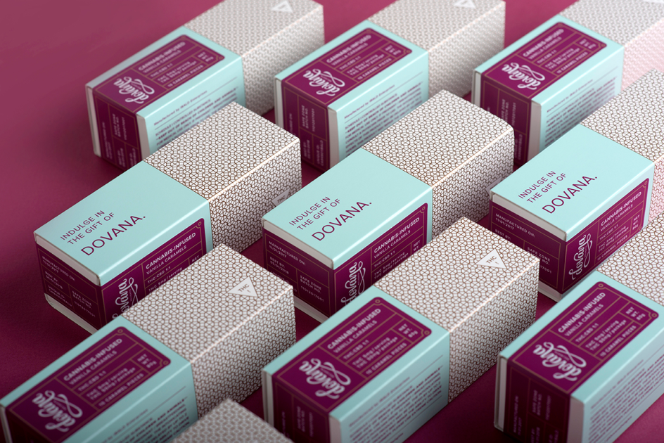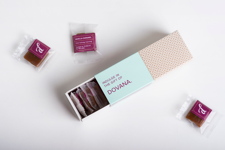 Noise 13’s reproach concluded that the target audience for the products was “female to androgynous, 30-70 years of age, new and existing cannabis users.” As such, they decided on a name and brand personality that looked to “exude luxury but still be approachable.” Dovana means “gift” in Lithuanian, and hints at the family’s heritage, “as well as a way to subtly acknowledge the restorative and relaxing effects of cannabis,” says the agency. “The logo reflects this meaning — it has a sense of indulgence, with custom lettering that swooshes and swirls, reminding us of the soft and lavish caramels themselves.”