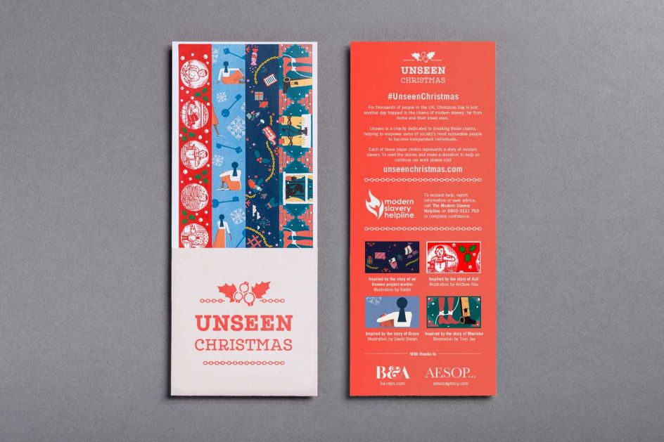London agency Aesop has created a compelling Christmas campaign for the modern slavery charity – Unseen. Working with a number of the UK’s top illustrators – it has devised a unique series that uses paper chain strips to illustrate stories of modern slavery.