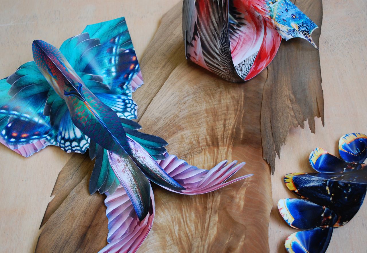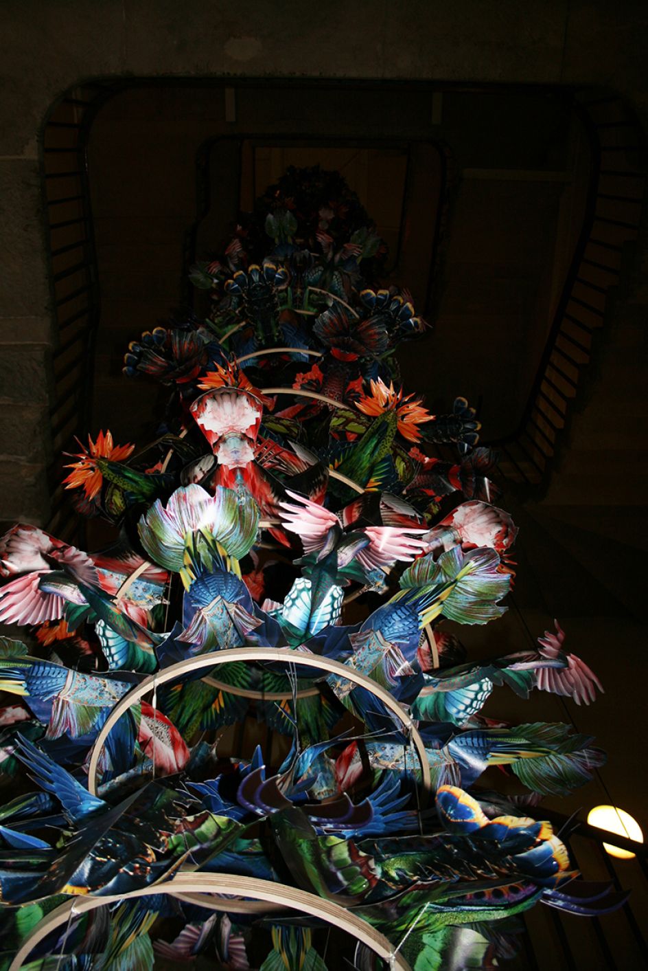 The result is a paper chandelier which is created from a range of animal details such as: Japanese lobster tails, flamingoes, butterflies, african green parrots, bird of paradise flowers, and many more. See the installation for yourself, showing until early March 2014.