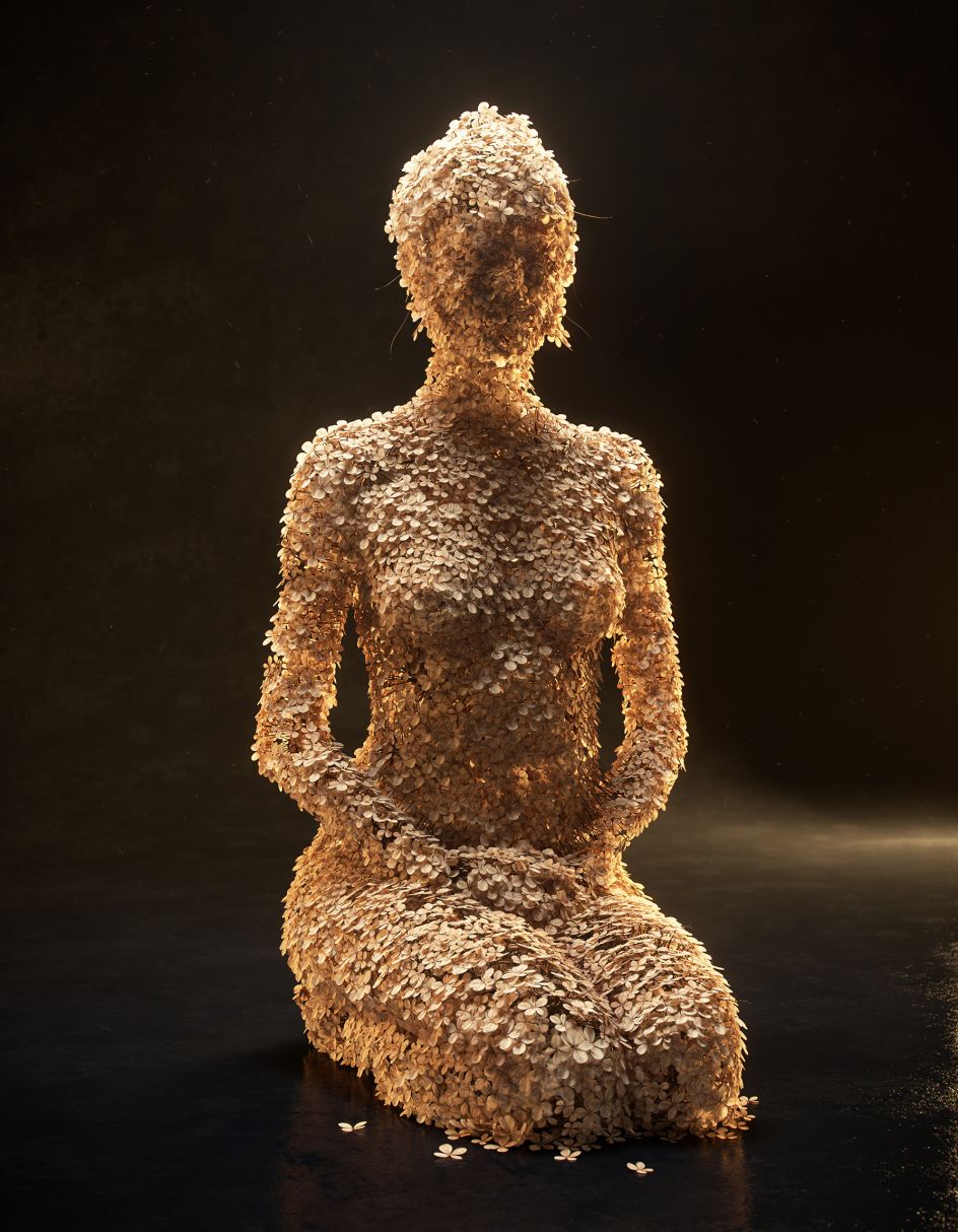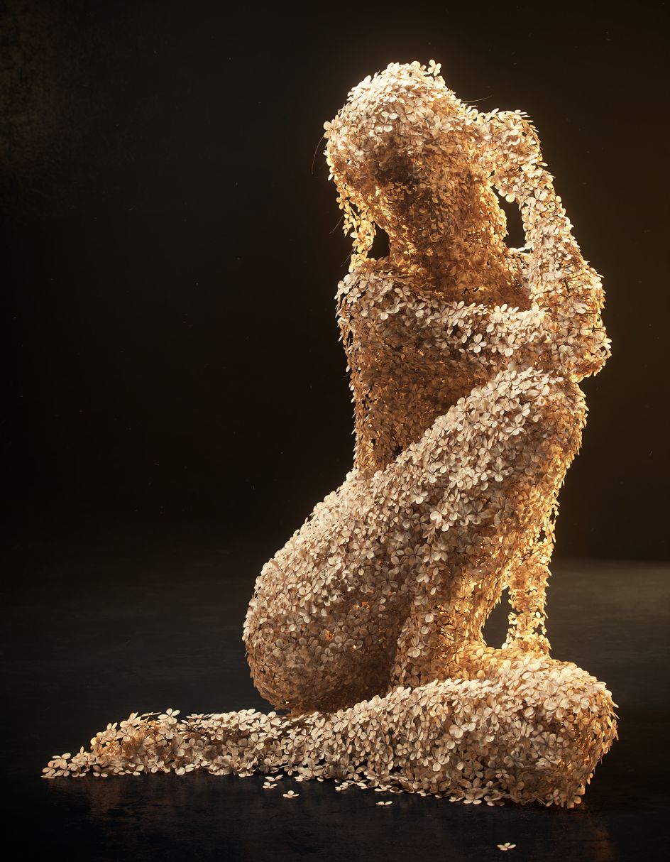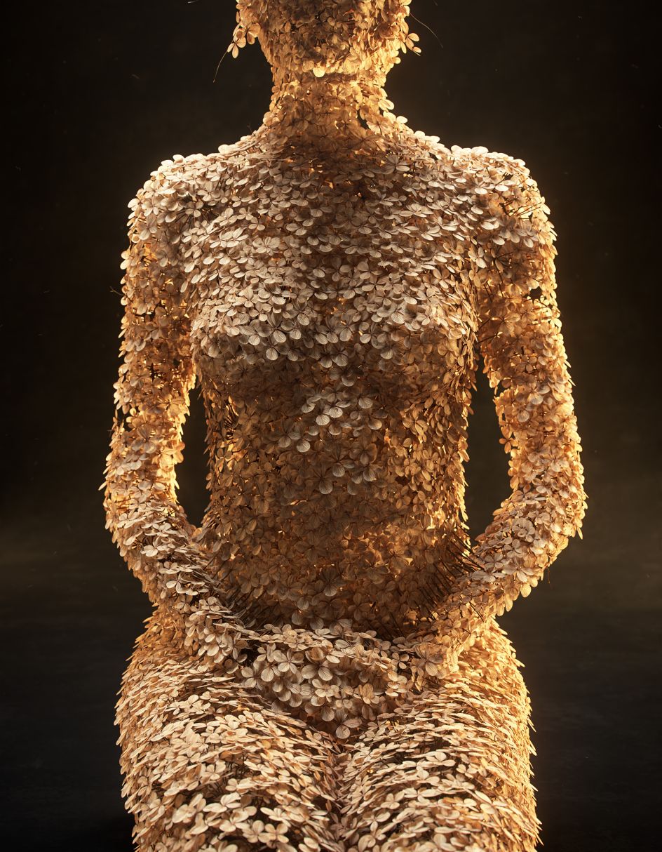 The dried flowers have been meticulously layered and multiplied over a framework of a female body so perfectly that it is impossible to tell whether the final pieces are indeed real. Using a mix of 3D scanning and tools such as Houdini, Maya and Redshift – Jean-Michel depicts the female form in various poses – from sitting and kneeling to dancing. A nice touch is the addition of single hydrangea petals that lie close to each figure, as though they have fallen from her frame.