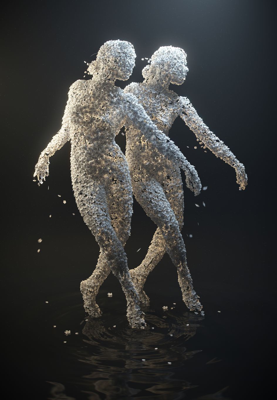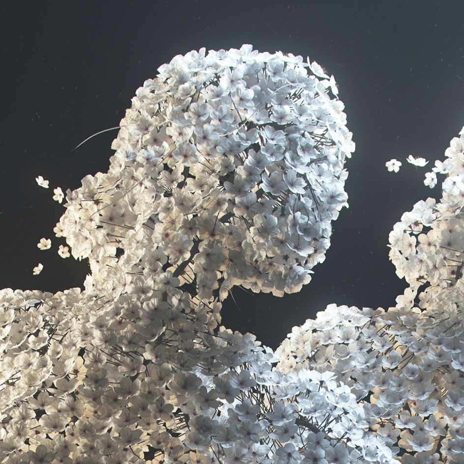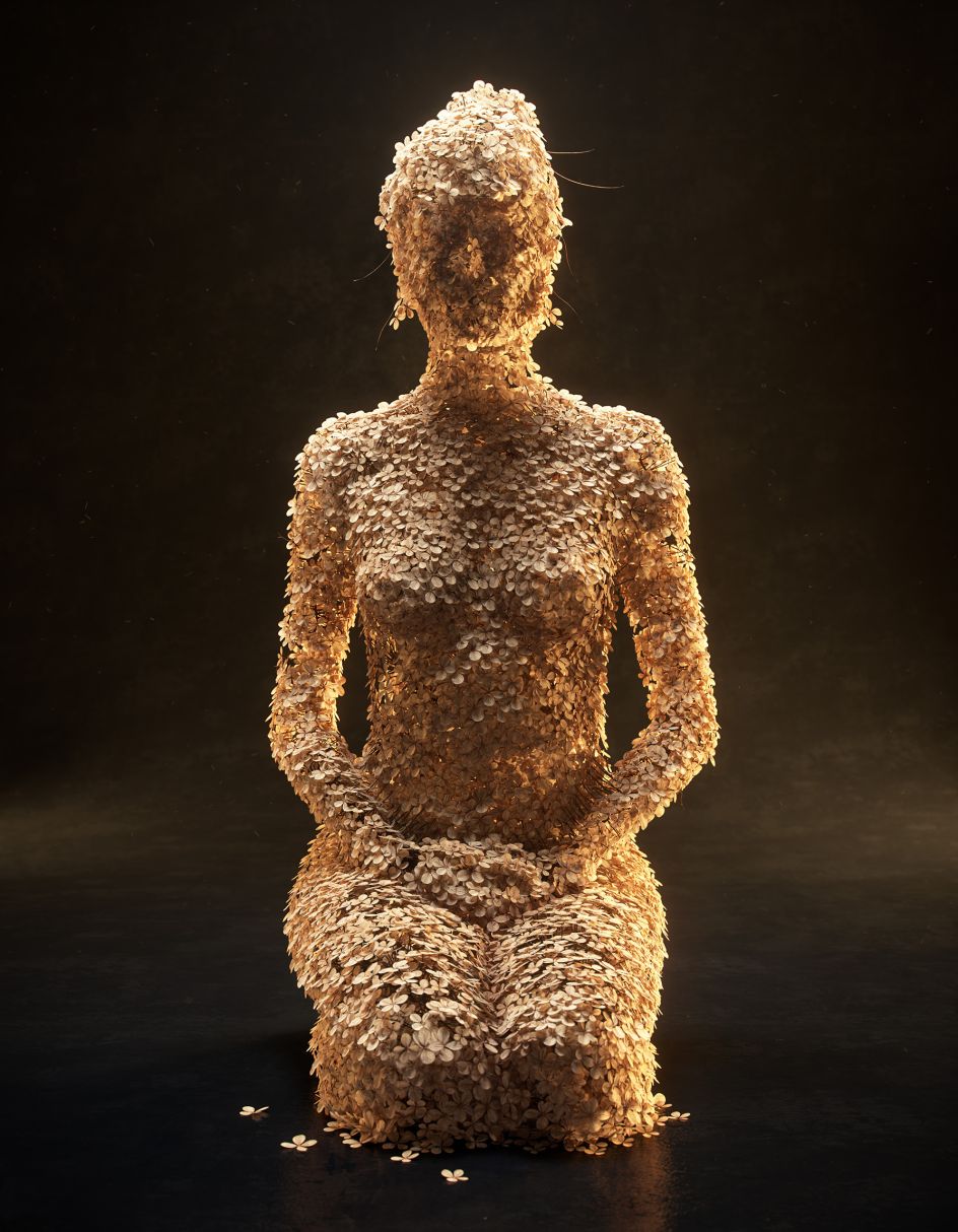 The dried flowers have been meticulously layered and multiplied over a framework of a female body so perfectly that it is impossible to tell whether the final pieces are indeed real. Using a mix of 3D scanning and tools such as Houdini, Maya and Redshift – Jean-Michel depicts the female form in various poses – from sitting and kneeling to dancing. A nice touch is the addition of single hydrangea petals that lie close to each figure, as though they have fallen from her frame.