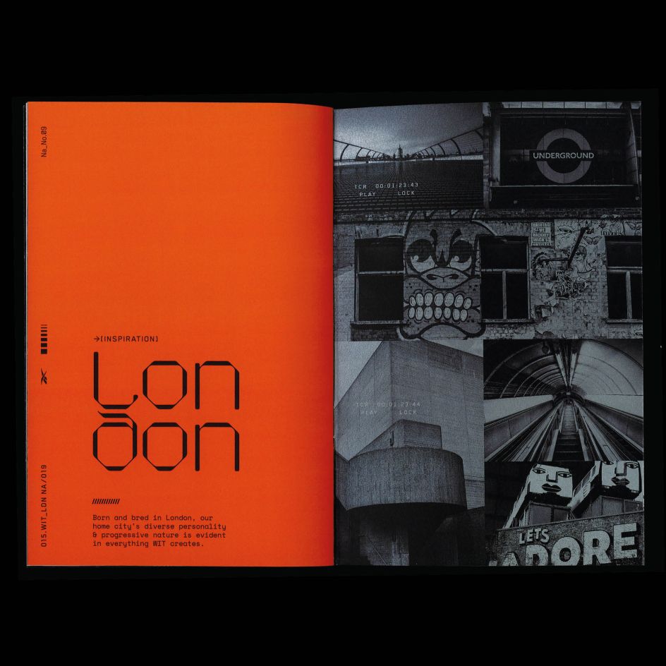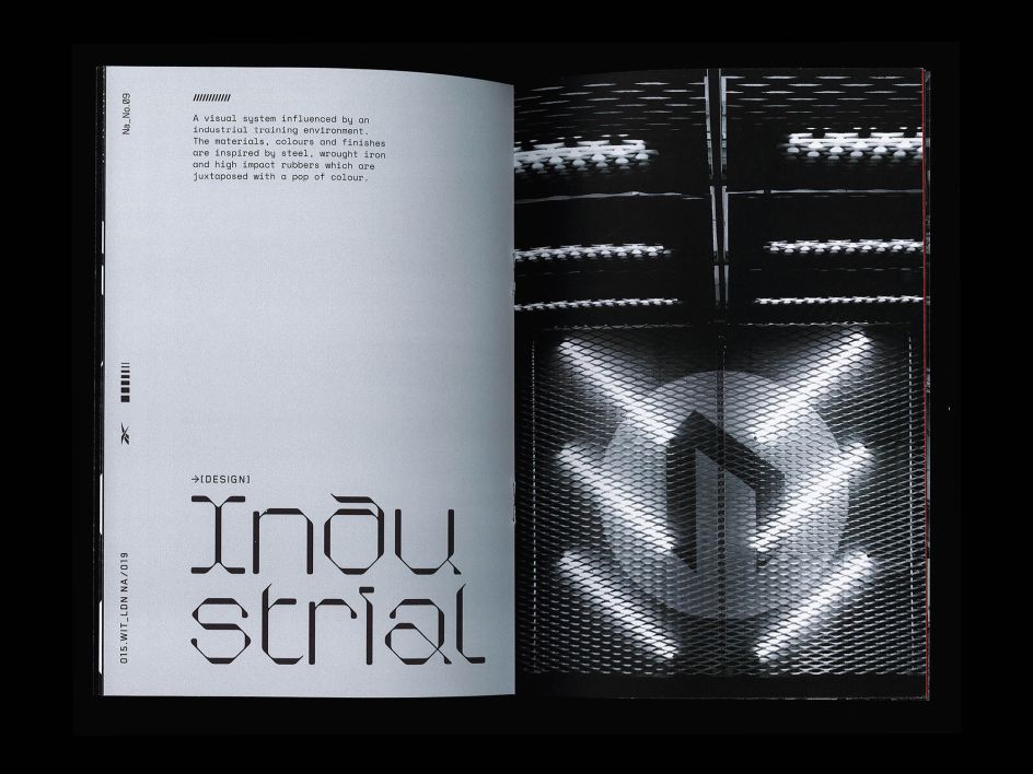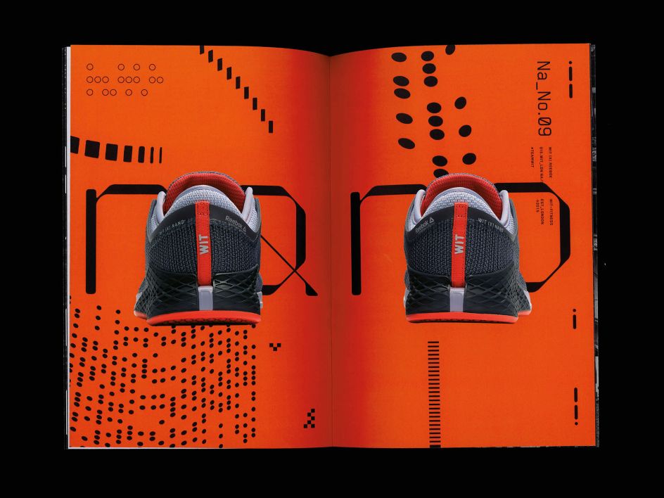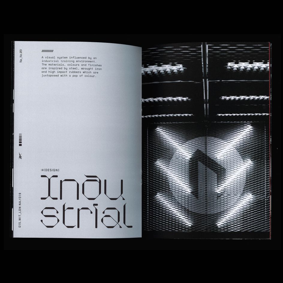 Fluoro was briefed to create a design that would work for Reebok while also embodying the WIT "stronger together" ethos. This led to the development of a visual and typographic system influenced by WITs "industrial training environment", as the studio puts it. "The material colours and finishes are inspired by steel, wrought iron and high impact rubbers which are juxtaposed against a vibrant orange."