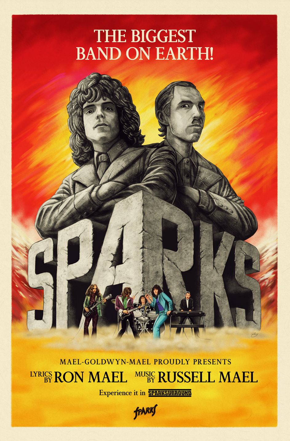"My poster of Sparks is only seen briefly in his 2021 documentary, The Sparks Brothers, but painting this homage to classic epic movie posters like Ben Hur and El-Cid (because in the film, they talk about having wanted to be the biggest band in the world) was a joy," Gilbey explains.