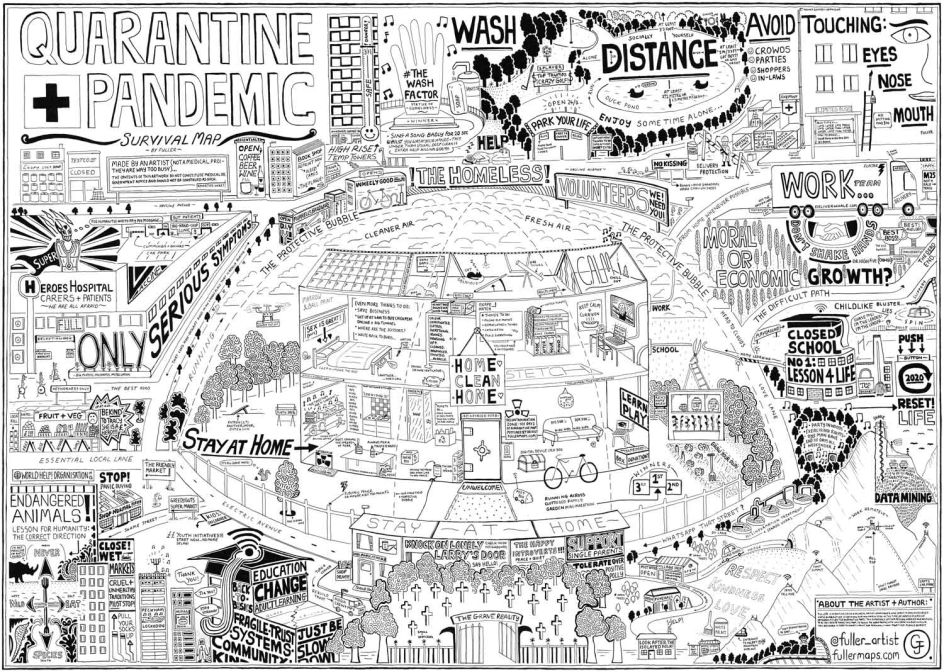 Known simply as Fuller, he usually walks thousands of miles to research his distinctive hand-drawn maps, but like many across the globe, his movements are restricted by the ongoing COVID-19 outbreak. So his most recent work, the Quarantine + Pandemic Survival Map, is a "map of the mind" that explores how to survive, and in some cases thrive, during home confinement.