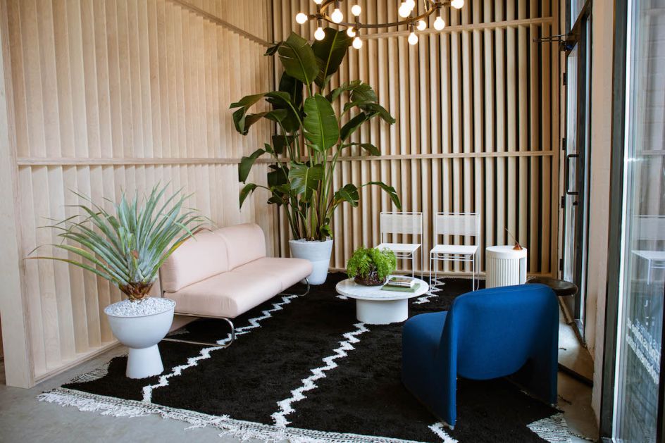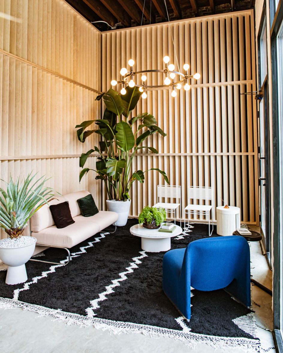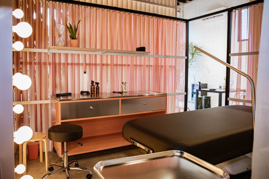 The space comprises five individual rooms prioritising client privacy and COVID safety. A mixture of vintage, new and custom pieces from Brooklyn Fabrication adorn the shop alongside black accents, local art and a stocked fridge for patrons to enjoy.