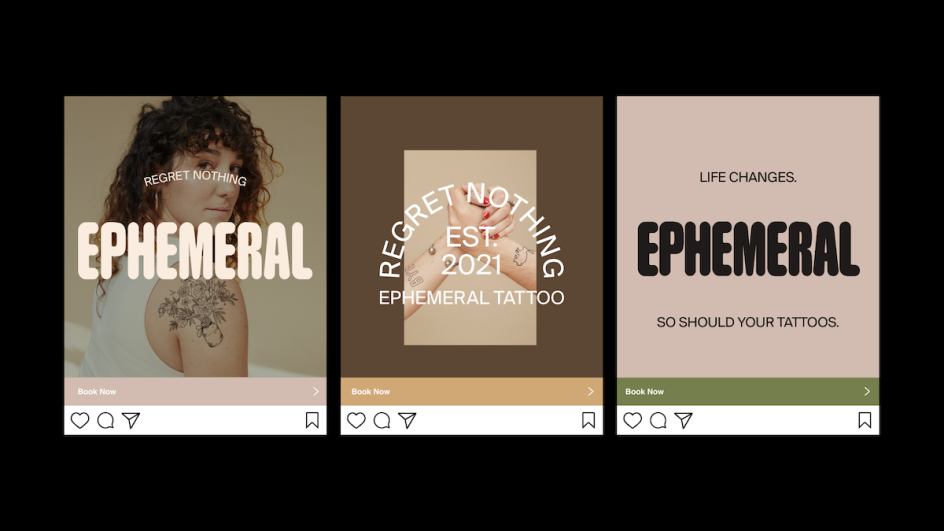 The brand uses various slogans as straplines, such as: Made to Fade; Regret Nothing; and Real Tattoos: Gone in a Year. The brand typeface for other applications is various weights of Suisse BP International. A muted colour palette of shades of brown, beige, green, grey and black is used across all touchpoints including backdrops for other branding elements, like the wordmark; photography backgrounds; on posters; across social posts and more.
