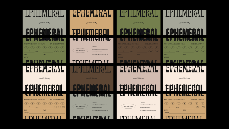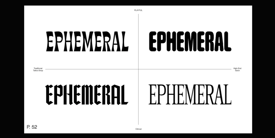 Funeral created four logos – which are essentially wordmarks, rather than traditional logos – in the end with the intention that they spoke to "an inclusive demographic that accounts for variety and shifting behaviour". All logos were designed on a grid and use the same kerning to give the sense that they have a cohesion of sorts and "inform one another." The agency created four distinct variations on the Ephemeral wordmark that each bear a different font style, ranging from a cartoonishly playful rounded sans serif to a Blackletter-style font to a more traditional looking serif. All wordmarks are set in all caps.