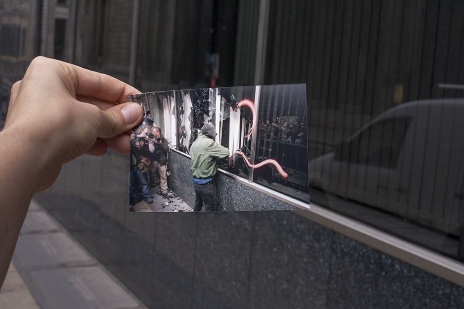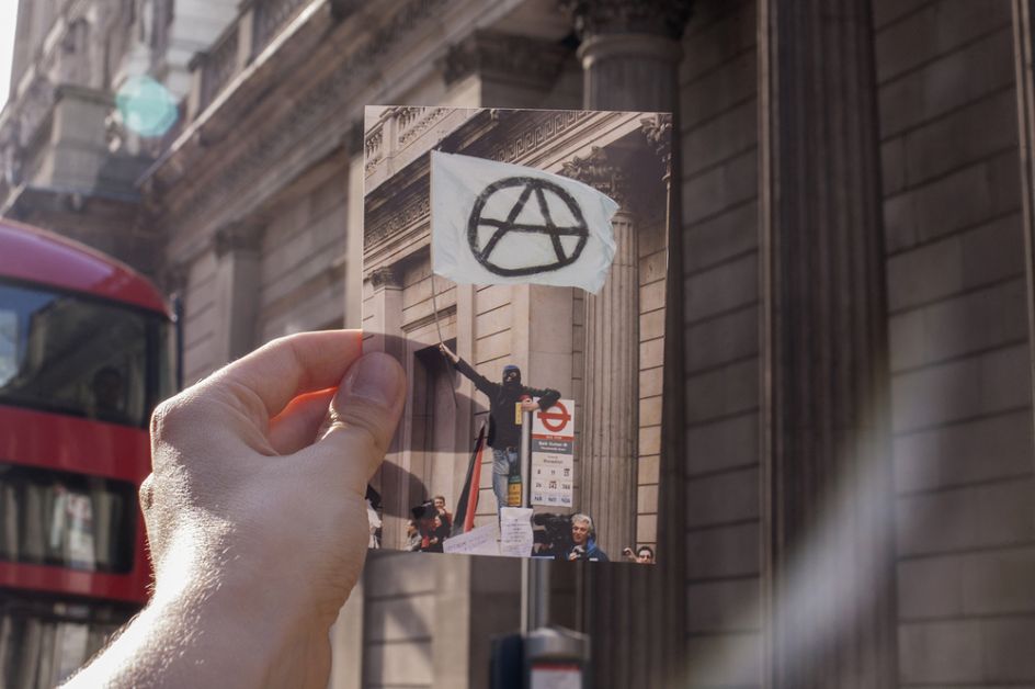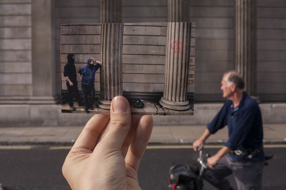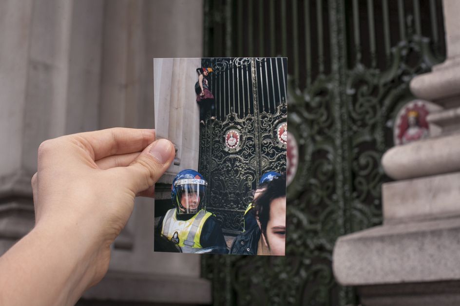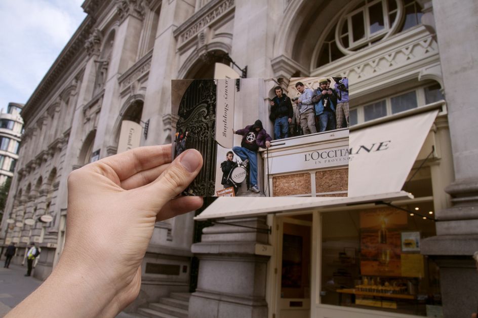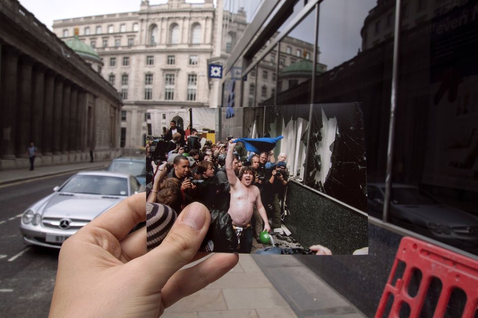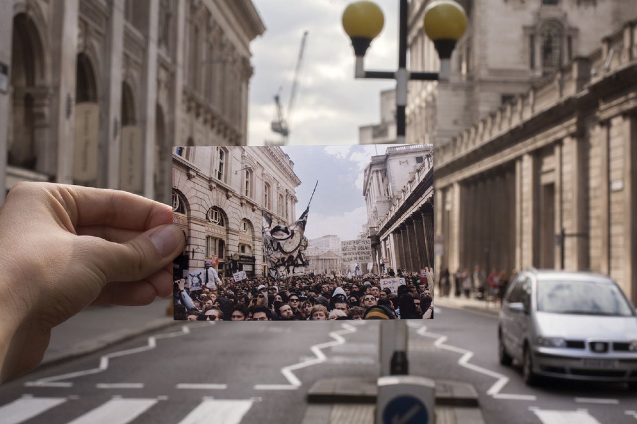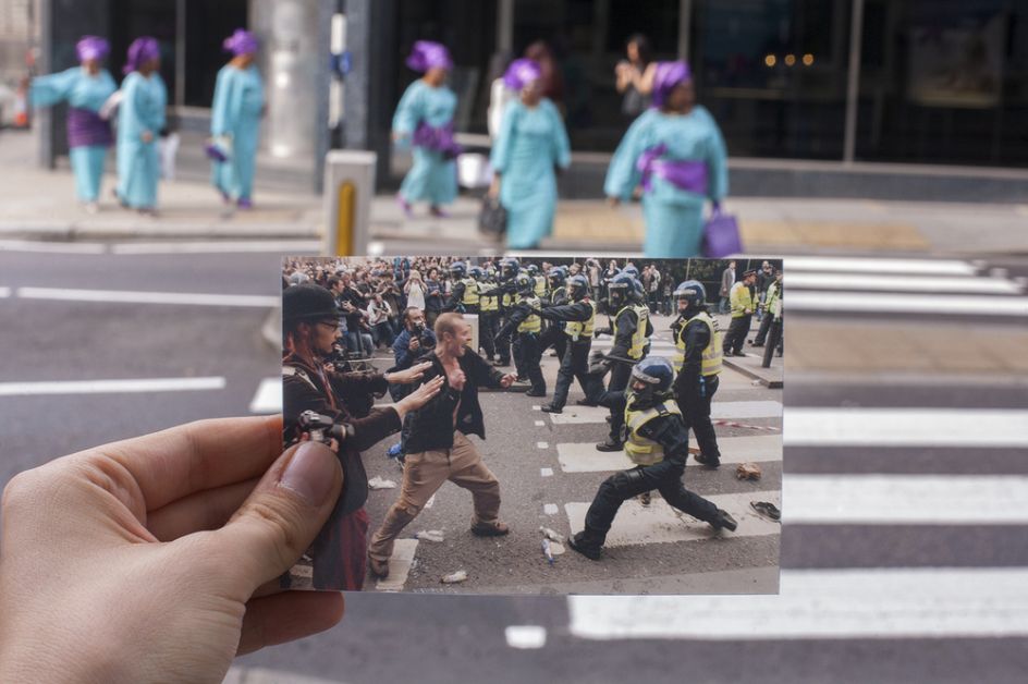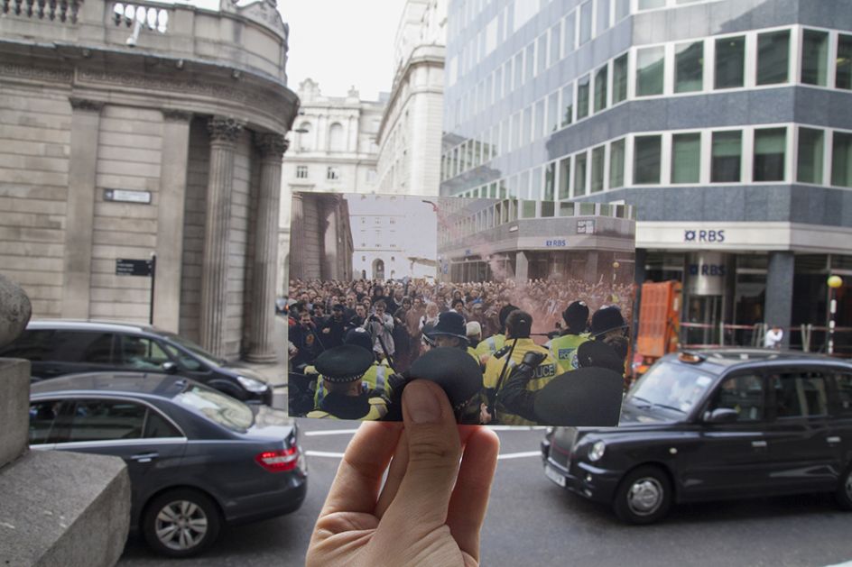 G20 Double Takes is a series by documentary photographer Billy Macrae that revisits scenes of public protest during the last G20 meeting in London by adopting the popular strategy of the ‘double take’, often used for displaying romantic ideas of the past against cruder and less elegiac visions of the present.