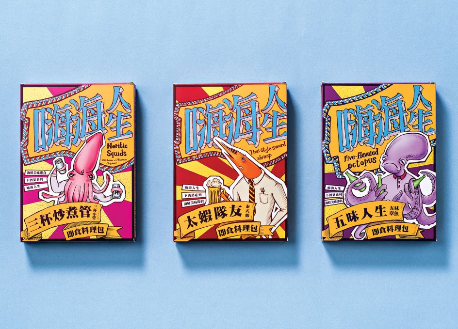 Hai Hai Ren Sheng is a ready-to-eat seafood brand, whose products are made from fresh seafood in Keelung, north Taiwan's largest harbour. The branding use hand-painting to anthropomorphize squid, shrimp and octopus, along with references to local proverbs.