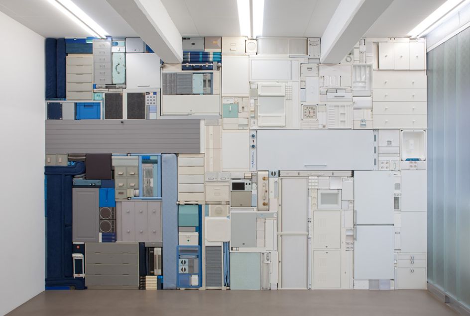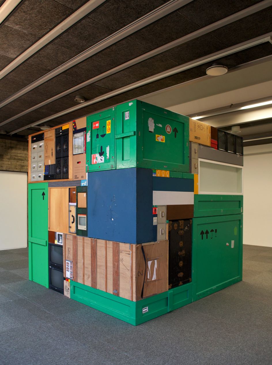 Taking things like suitcases, boxes, cabinets and televisions, he brings order to chaos and produces Tetris-inspired installations which are made up of familiar shapes in a spectrum of colours, all stacked up on top of one another. While most are huge public art sculptures, such as those amongst shipping containers or between whole buildings; others are made especially for exhibitions and are on a slightly smaller scale.