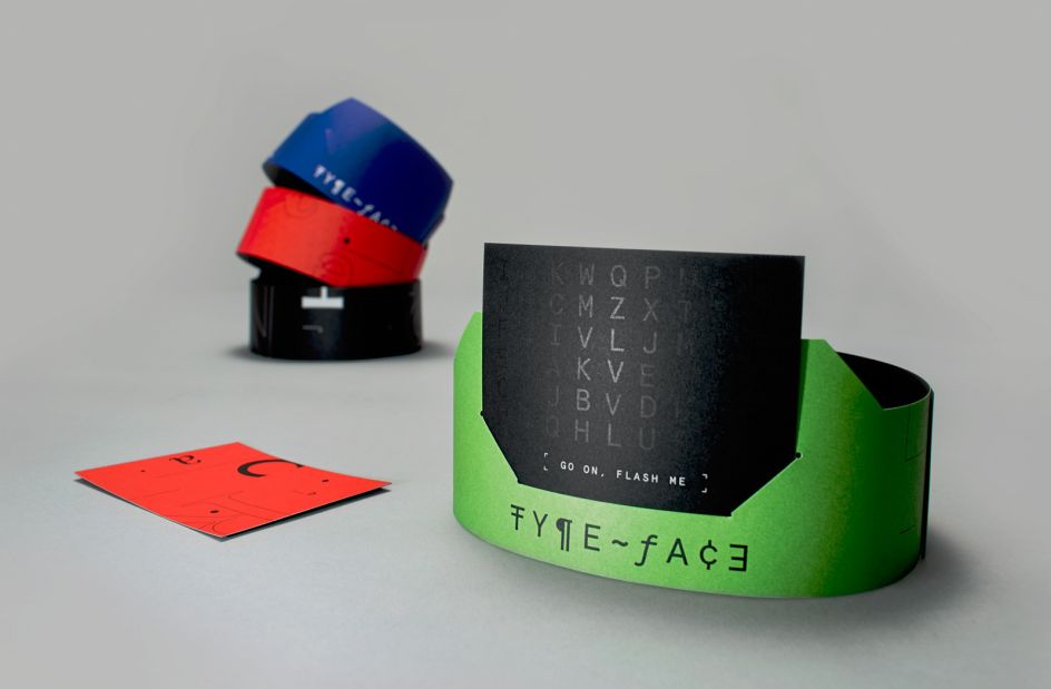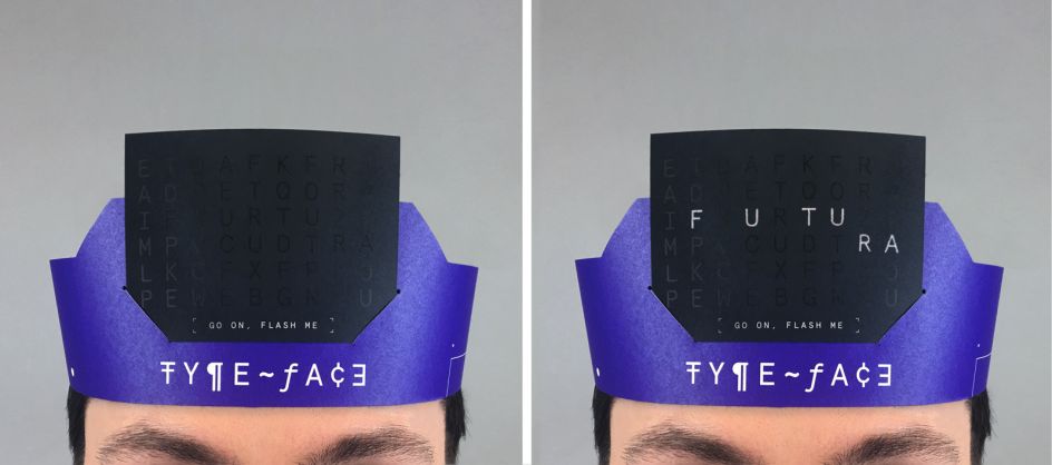 Type-Face bears some similarity to Hedbanz, as players put on a headband and place a card with a secret identity facing out for their opponent to see. But the similarities stop there. The identity is a typeface name, camouflaged in a pattern of letters, which can only be revealed by taking a flash photo with a smartphone – the name is printed using a special, light-activated ink.