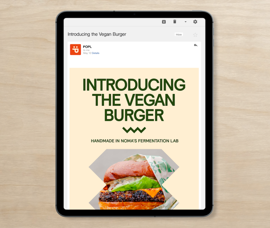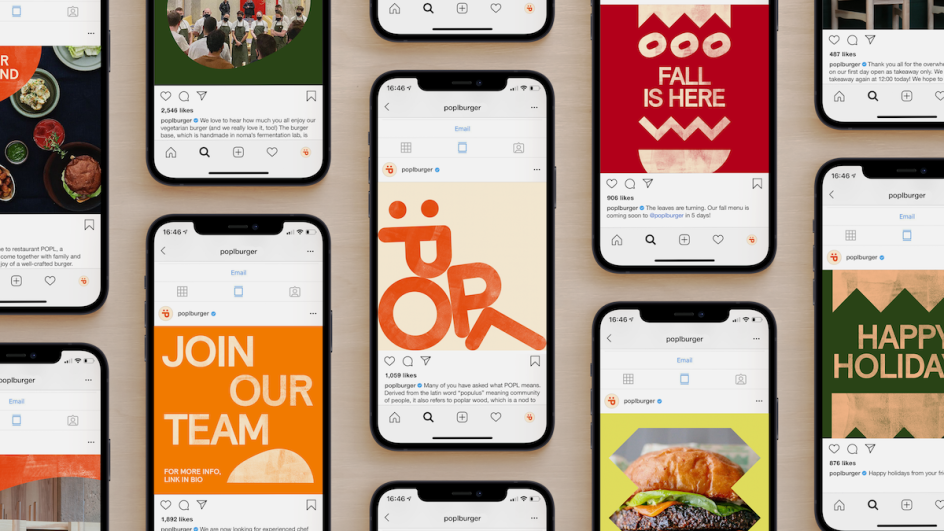 "Like the burger itself, POPL is a combination of playful ingredients," says Mulvaney. "The burger's ingredients inspired a library of geometric, graphic forms. The burger's format inspired the signature behaviour: stacking. This meaningful and memorable behaviour drives layout and movement. The graphic forms, type, and image can stack on their own or be mixed. The system allows for variation and expression while being consistently recognisable."