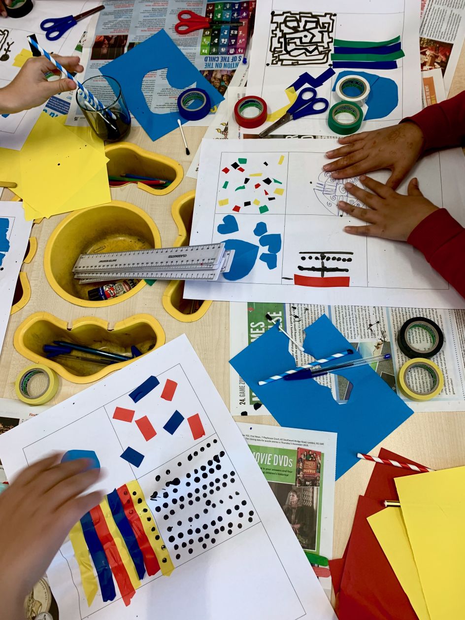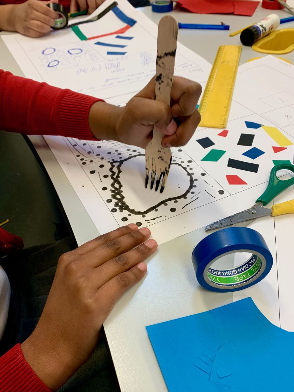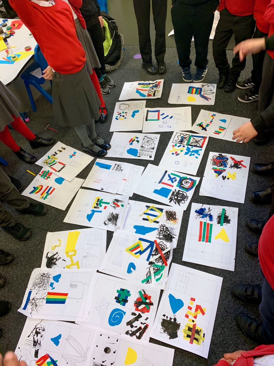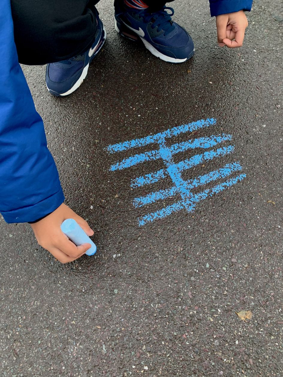 Coco and the youngsters also took inspiration from the location of their school, using the different shapes and patterns they could see around them. From the repeated rectangles of their classroom windows to the stripey shadows of their playground fencing, they searched for shapes big and small, high and low. Returning to the classroom, the pupils documented their findings through big chalk drawings on their playground floor.
