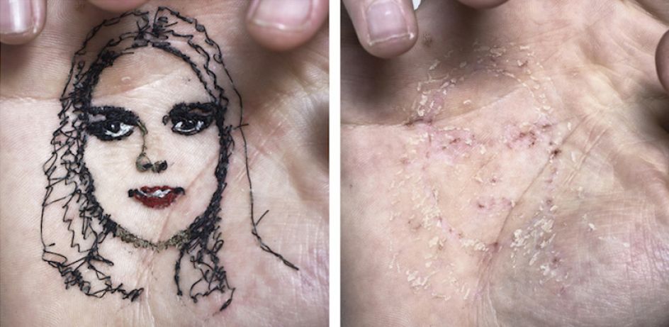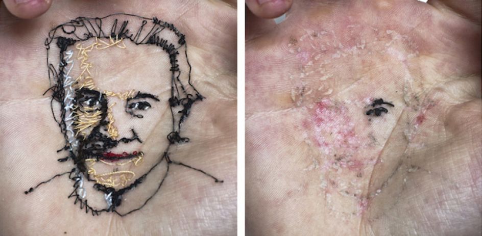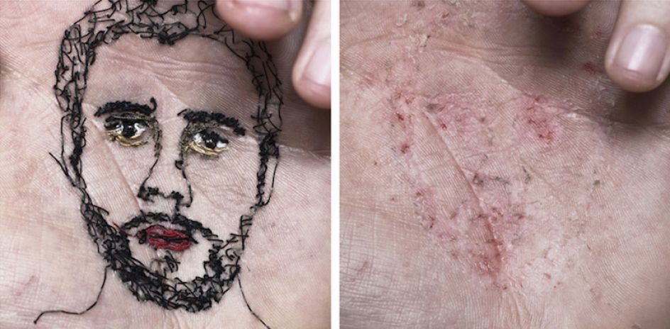David, who also uses his body as a canvas to write an autobiographical diary, has created this unique series, called 'A Flor de Piel', to pay homage to those who have had an impact on his life – teachers, parents, friends, family – they are all sewn into the palm of his hand. Watch the video below to understand more.