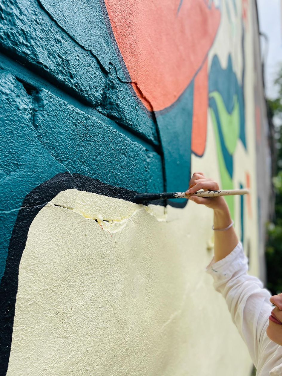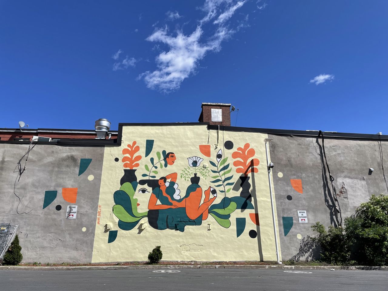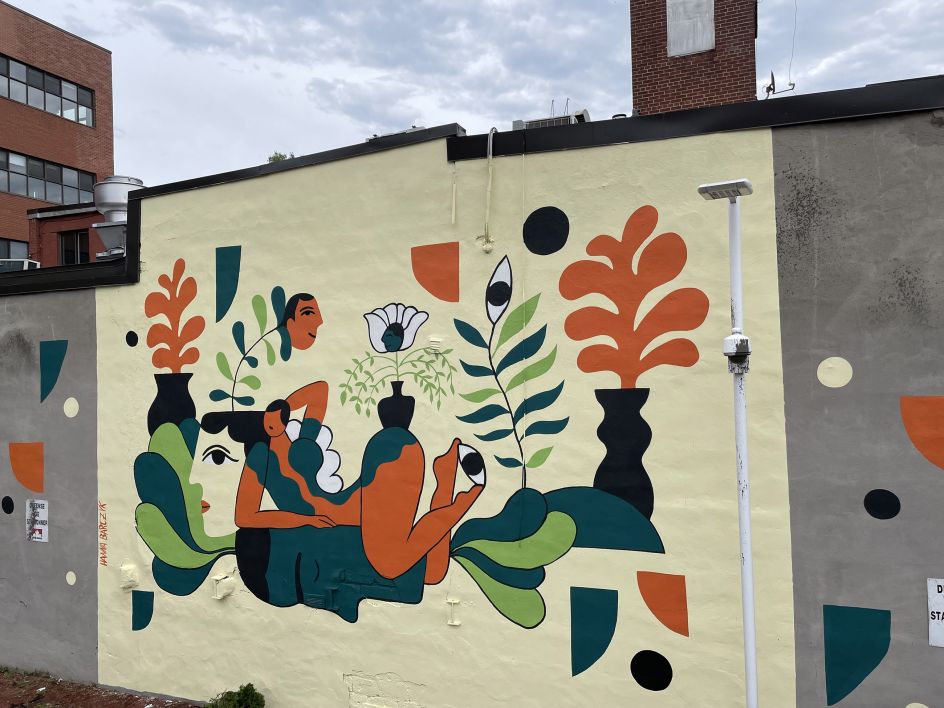 In Harmony captures the essence of better living while portraying the mindfulness that results from a sustainable lifestyle. "My work explores the idea of finding balance and harmony in life," Hanna explains. "In this mural, the figures, vines, faces and eyes represent interconnectivity between nature and awareness to maintain a sustainable lifestyle.