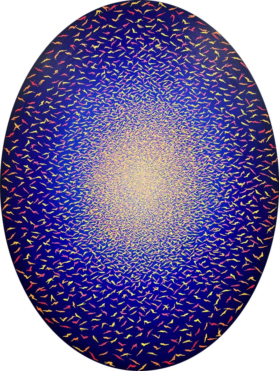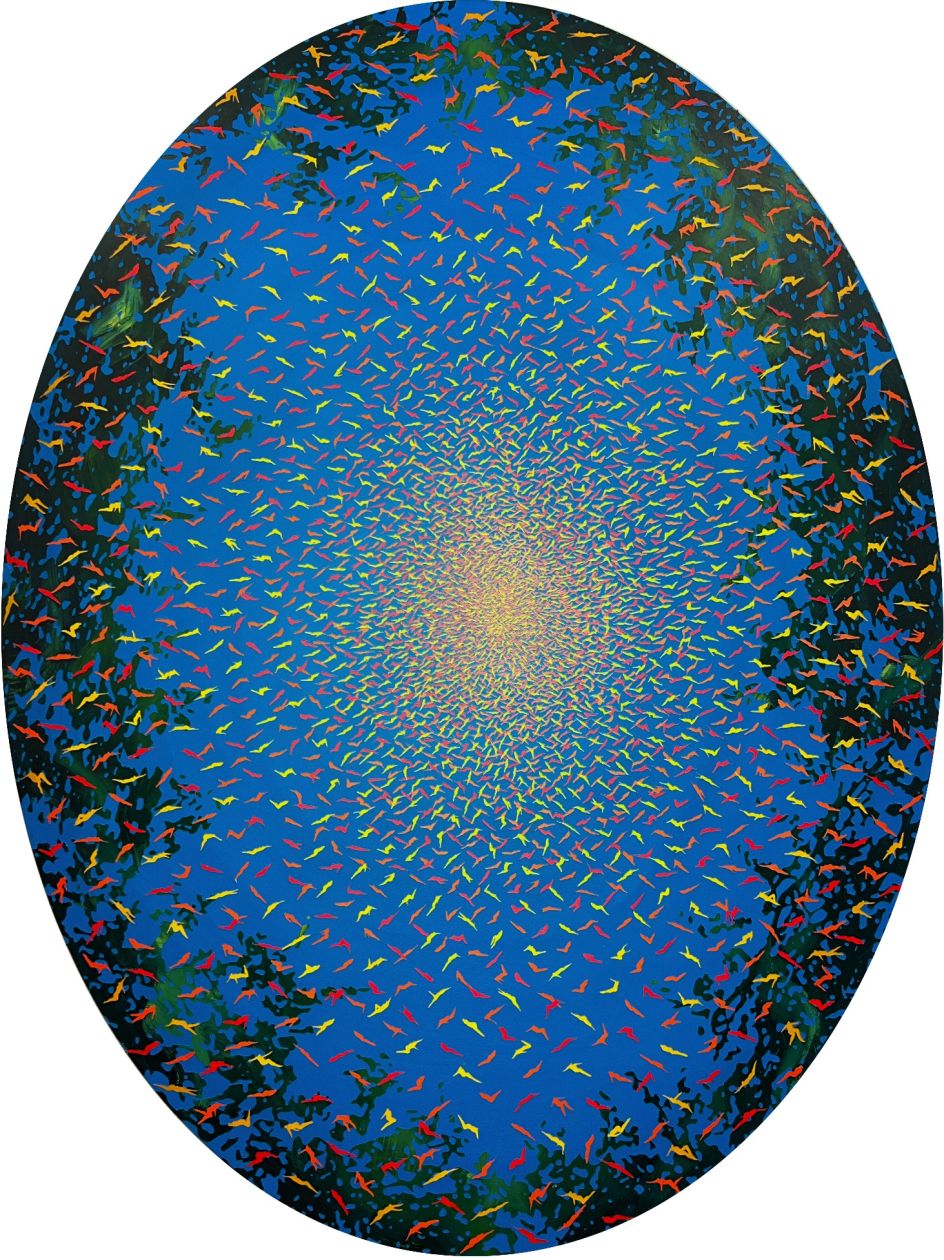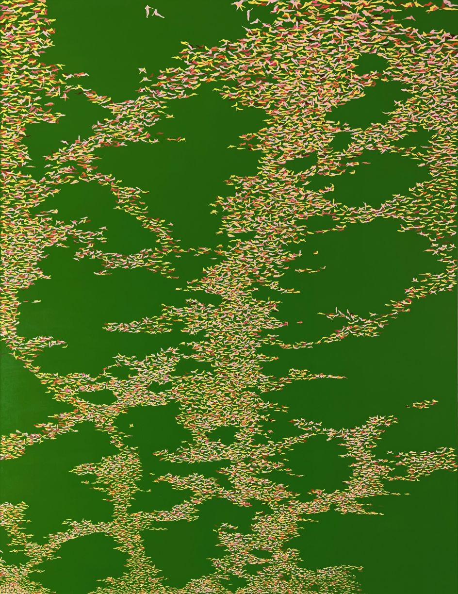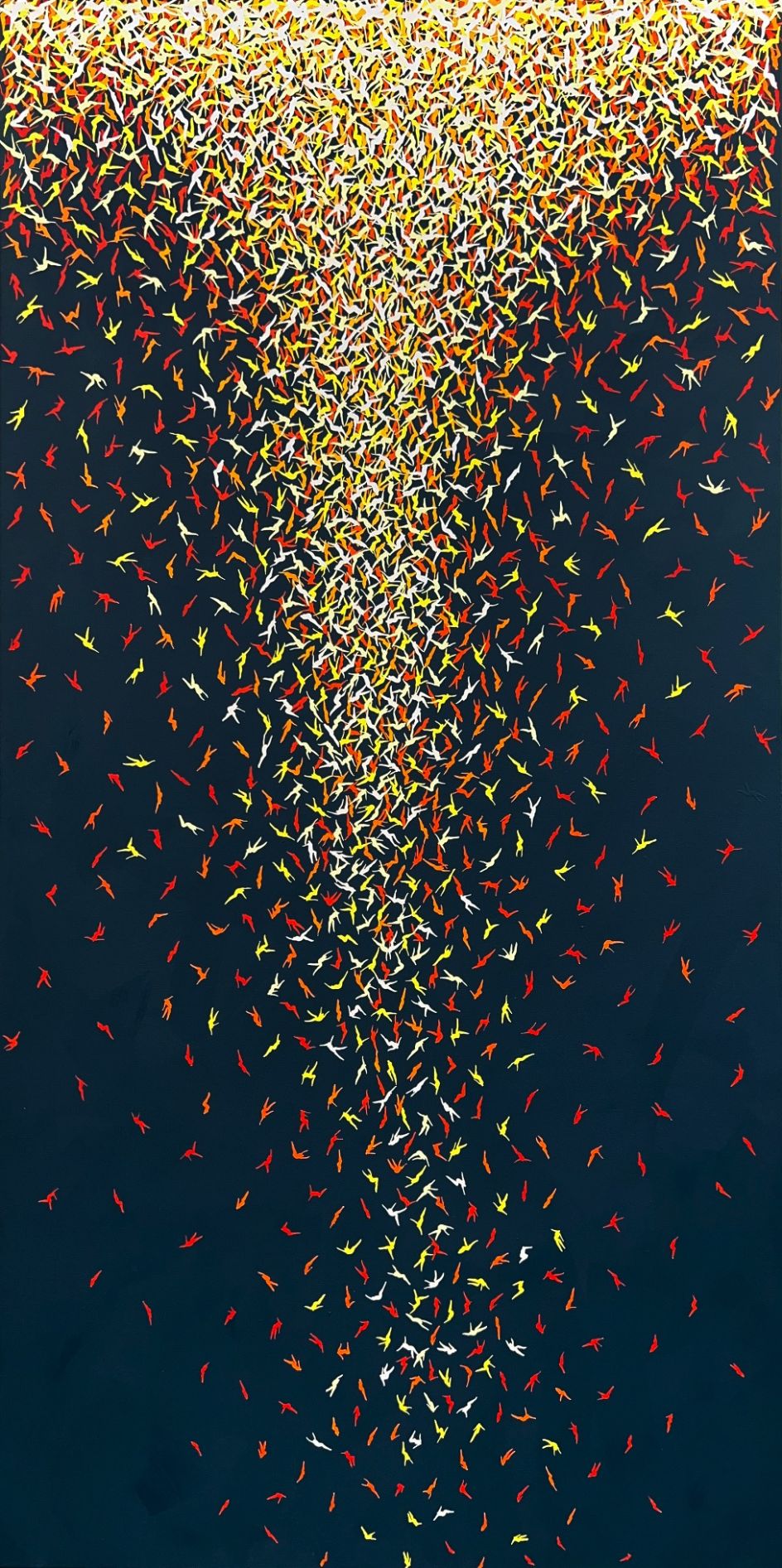 To achieve this, Harry's paintings depict crowds of intersecting figures which appear to float and fall in repeated silhouettes. When viewed from a distance, they appear to merge into a whole, creating a sense of joyful optimism but also foreboding. With the likes of Hieronymus Bosch's The Garden of Earthly Delights and Matisse's Bonheur de Vivre providing inspiration, the mass of human bodies can be read as either journeying down to Hell or drifting up into Heaven.