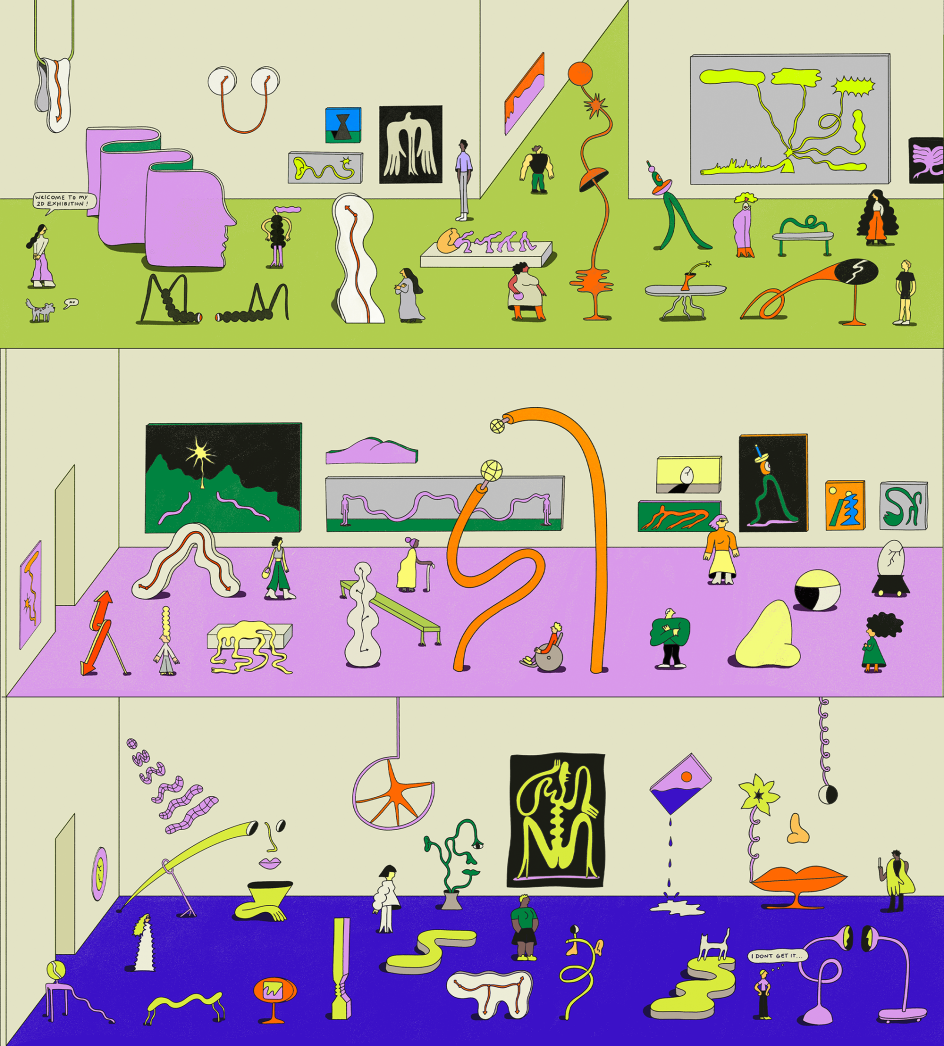 The outcome is repetitively beautiful and, indeed, very satisfying to watch. In another, more complex scene, Henri has crafted a multi-layered, comic-like illustration that they refer to as a "silly and fun" 2D museum. The antithesis to the serious tones of the ant animation, this one brings together doodles and sketches of various imagined elements – strange figures strolling by, paintings falling and dripping onto the floor, and a fitting speech bubble proclaiming, "I don't get it". Henri hopes to expand this piece one day and turn the concept into a game – we couldn't think of a media medium for it.