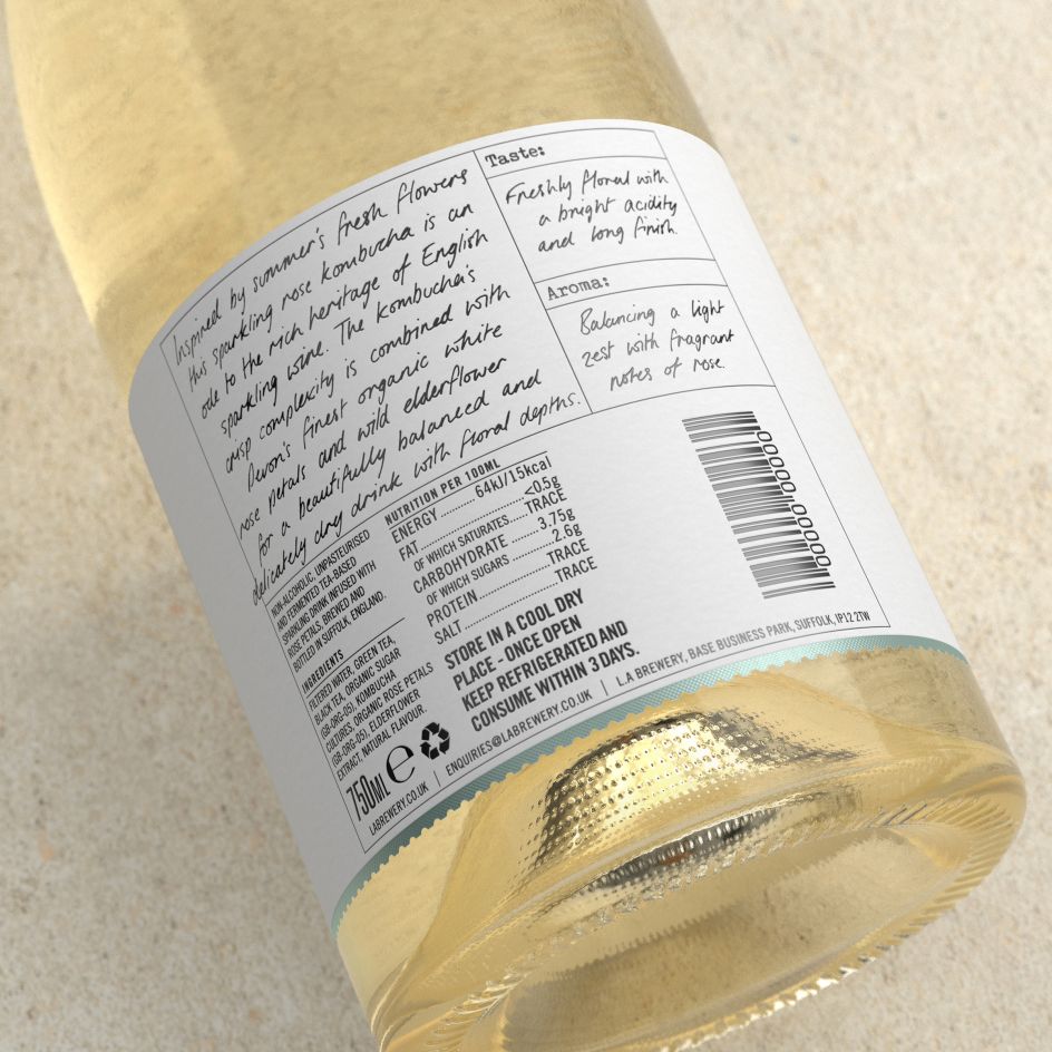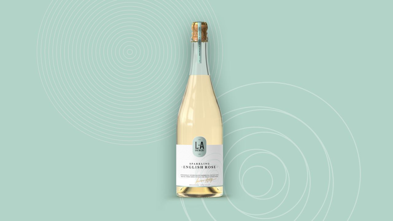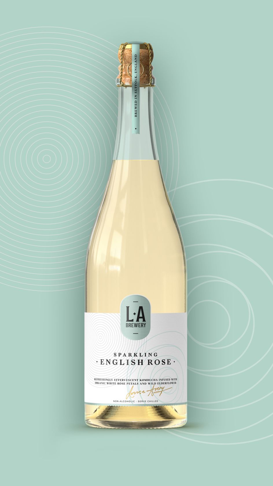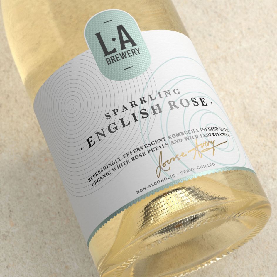 East London-based studio Here Design has created the branding and bottle designs the new Sparkling English Rose variant by L.A Brewery, a British kombucha brand that taps into the alcohol-abstinence temperance movement.
