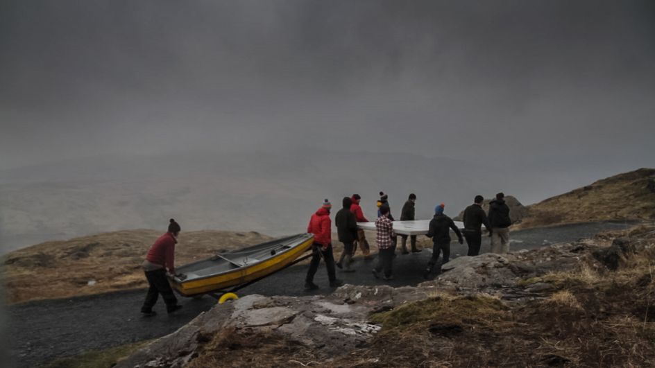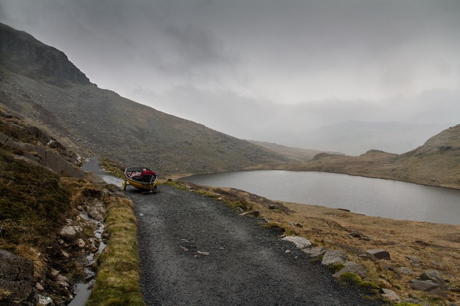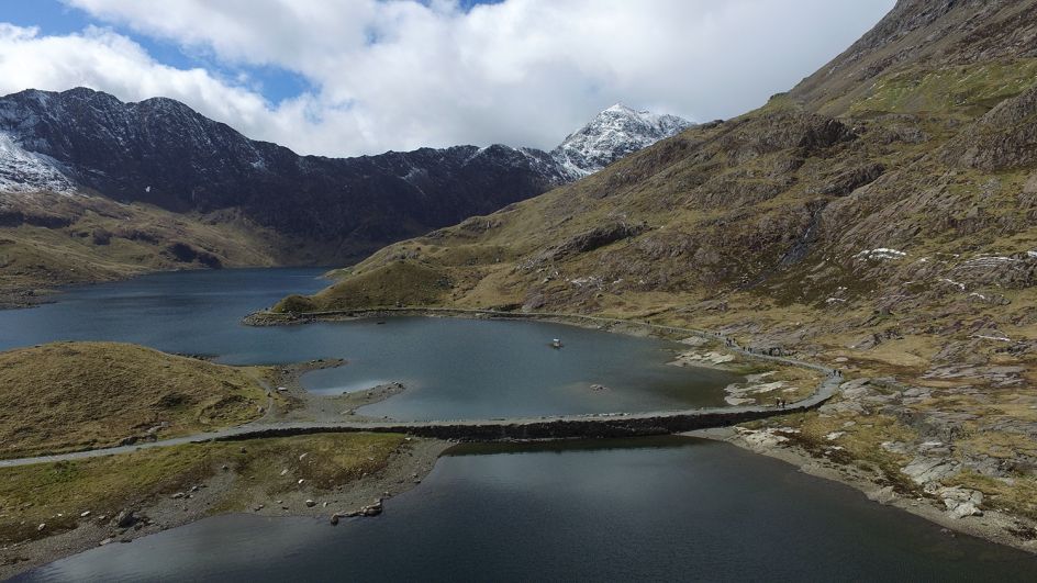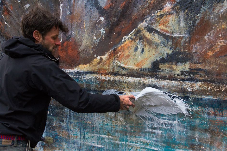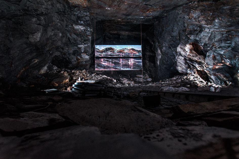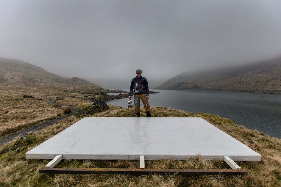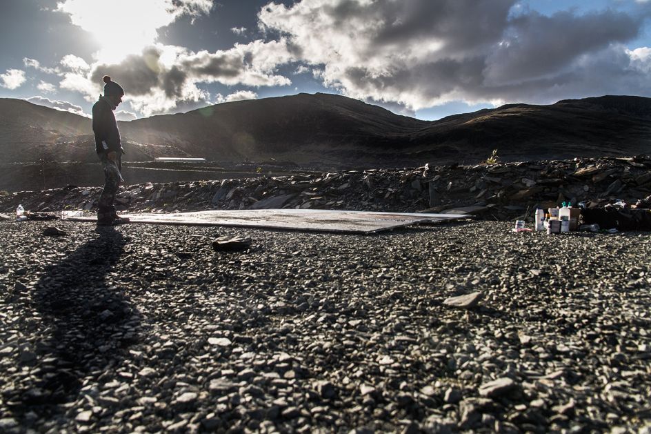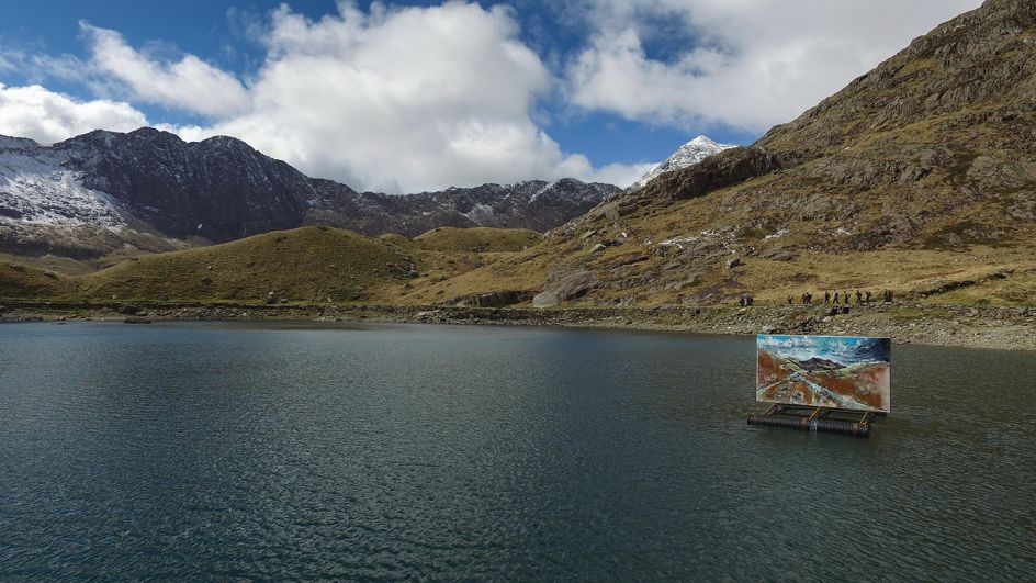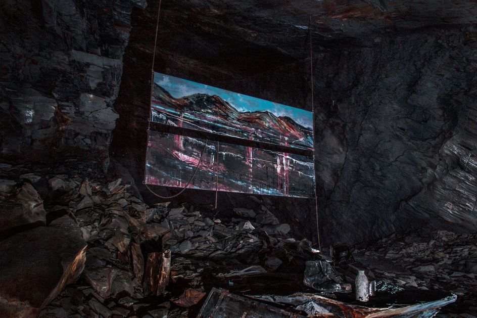 Broomhall explains: "Uchel ac Isel features two industrial-scale paintings, created by Anthony Garratt in the Welsh landscapes in which they now reside. One double-sided painting floats high on Llyn Llydaw lake, dwarfed by Mount Snowdon's grandeur and flickering in the wind, the other rests low, deep beneath the mountains in an abandoned slate mining cavern at Llechwedd.