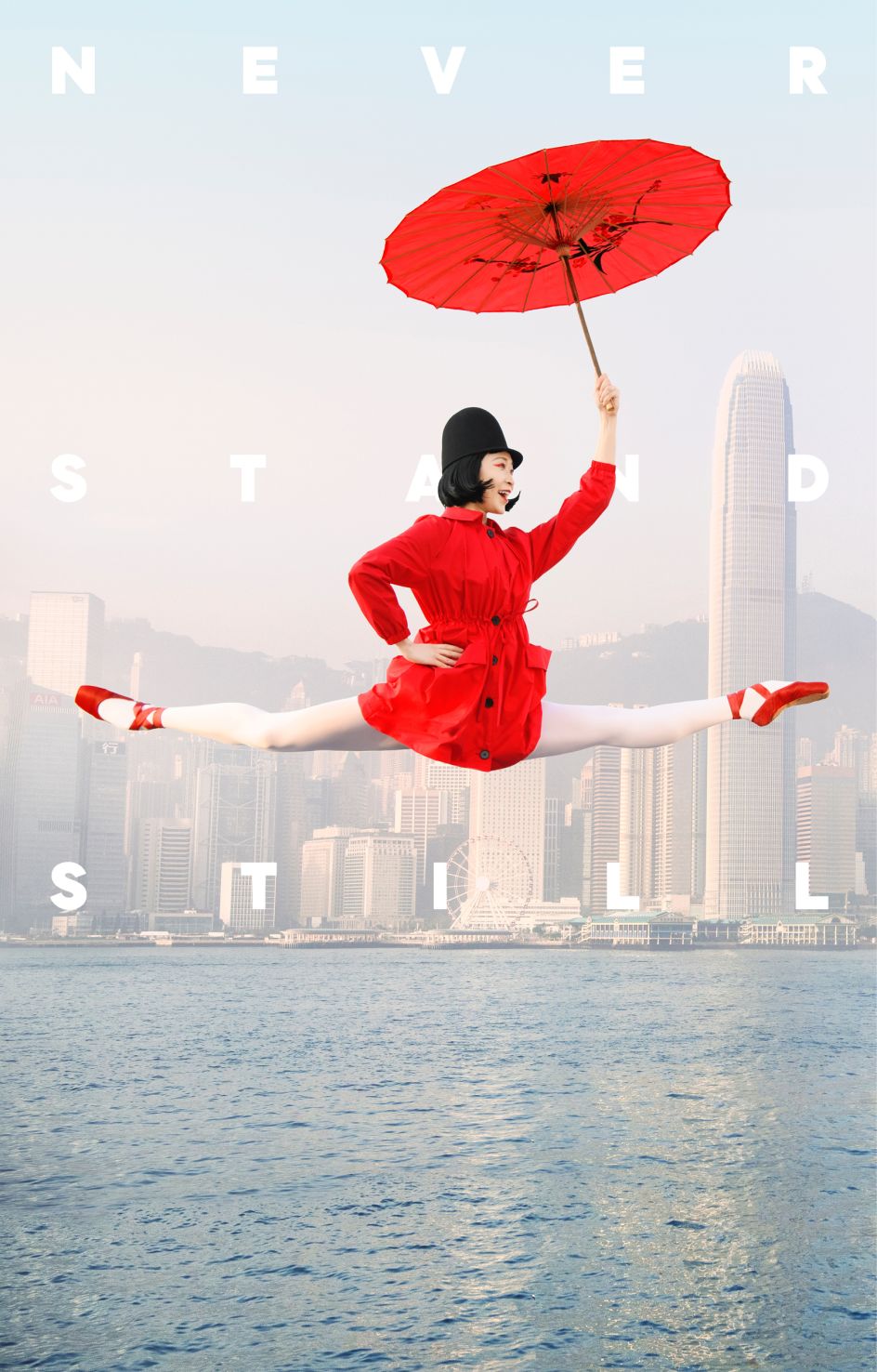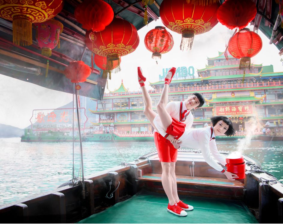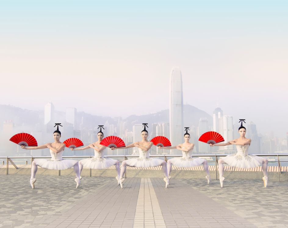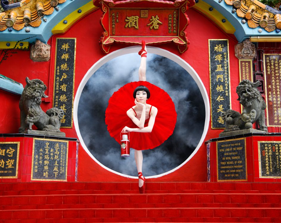 Conceived and gorgeously art directed in Hong Kong by DC-based creative agency Design Army, the campaign stars the classical dancers in the most anything-but-typical (or subtle!) visuals – striking insane airborne contortions in surreal settings (from balancing dim sum pots on boats to donning Mad Men retro) – all backdropped by Hong Kong landmarks newly reimagined.