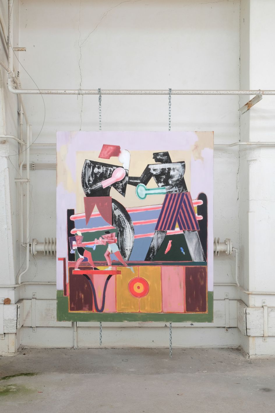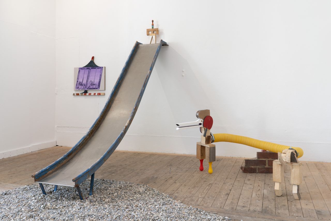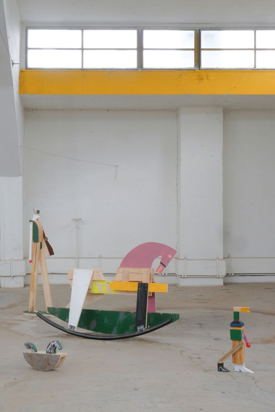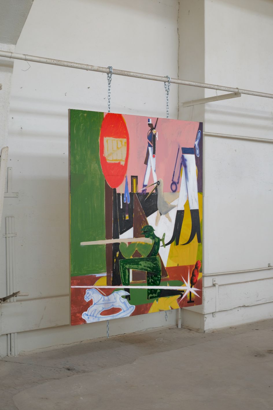 Two of Jonas' recent pieces encapsulate his distinctive approach to art. The first is a sculpture featuring yellow pipes resembling the playful shape of a dachshund. Radiating humour, these pipes, found on his way to the studio and originally intended to protect trees on construction sites, are given a new purpose as they inspire this canine creation. "I don't know if it was the colour or shape, but I couldn't resist hopping over the fence to take some with me." Another standout is Marie dreht eine Runde 1&2, a series of works that merge sculptural elements with paintings. The piece represents a moment where Jonas stepped beyond the confines of rectangular canvases, composed of an extendable table top found in a junkyard – "Luckily, a canvas from my studio fit exactly into it."