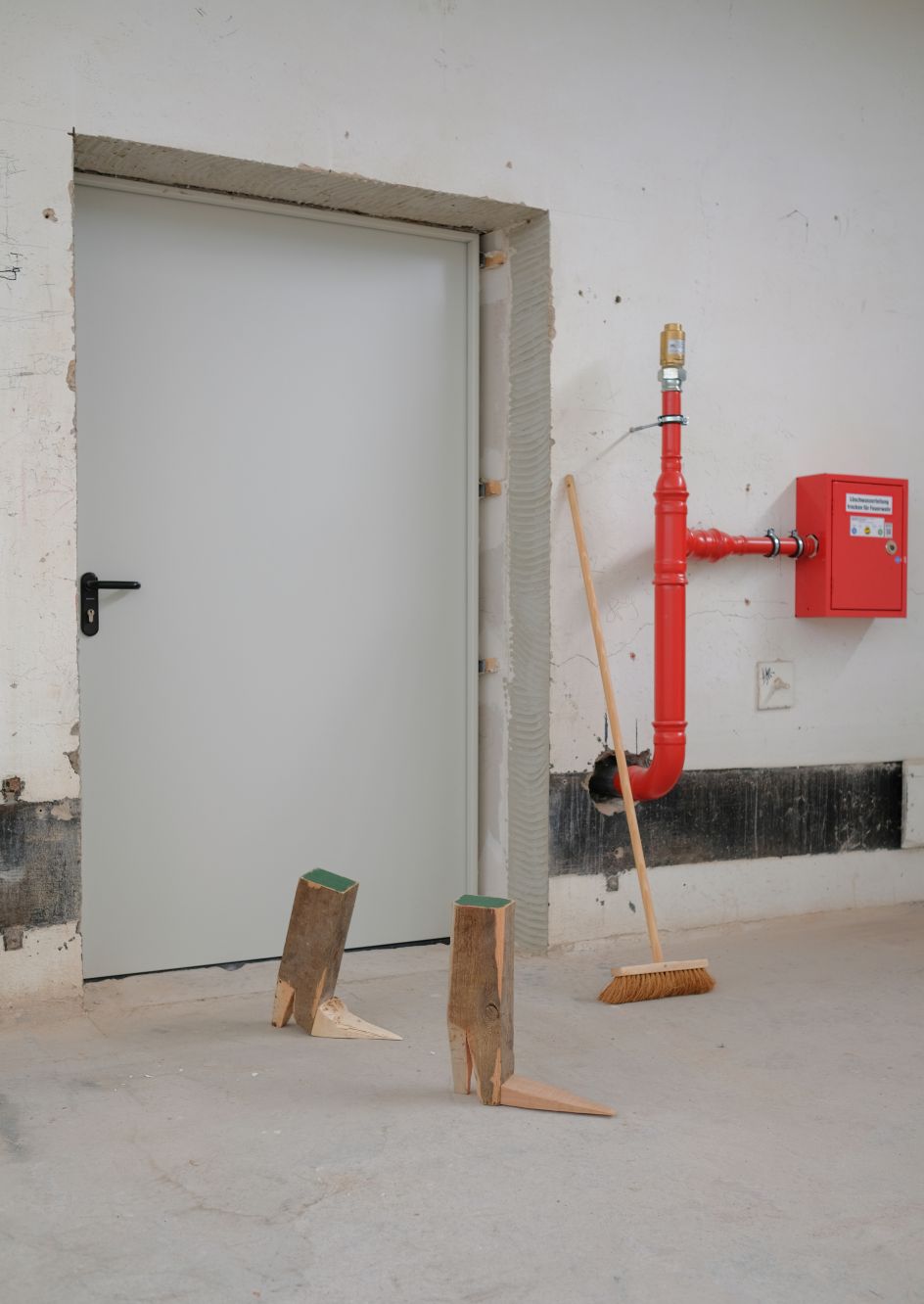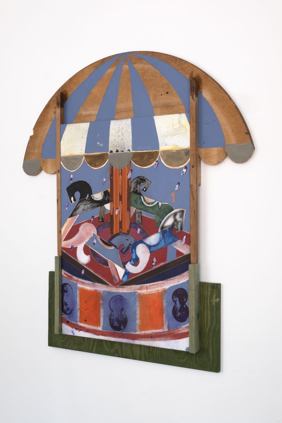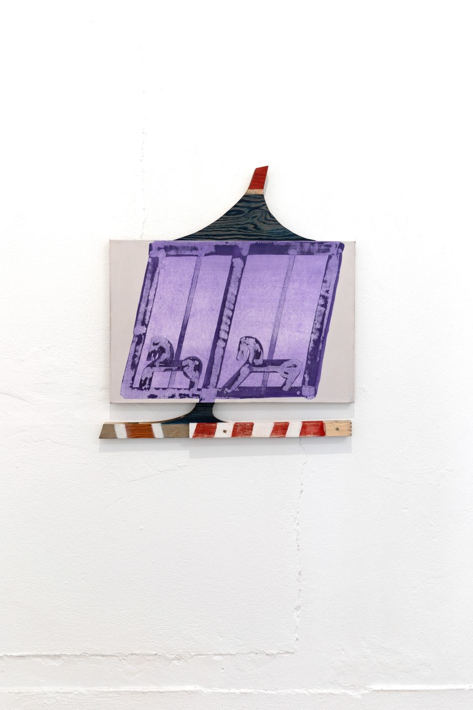 Two of Jonas' recent pieces encapsulate his distinctive approach to art. The first is a sculpture featuring yellow pipes resembling the playful shape of a dachshund. Radiating humour, these pipes, found on his way to the studio and originally intended to protect trees on construction sites, are given a new purpose as they inspire this canine creation. "I don't know if it was the colour or shape, but I couldn't resist hopping over the fence to take some with me." Another standout is Marie dreht eine Runde 1&2, a series of works that merge sculptural elements with paintings. The piece represents a moment where Jonas stepped beyond the confines of rectangular canvases, composed of an extendable table top found in a junkyard – "Luckily, a canvas from my studio fit exactly into it."