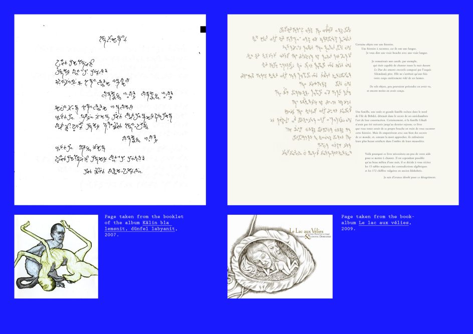 “My father spoke seven official languages. Klokobetz was number eight, an uncanny tongue he invented and reserved for secret personal conversations with me at night,” says the singer. “He moved out when I was 12, and during my teens, I began working on a written version of the alphabet. Trying to describe the characters with roman type was never enough—I had to imagine more accents and diphthongs, so I started to draw signs on paper.”