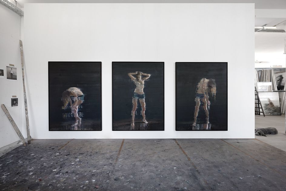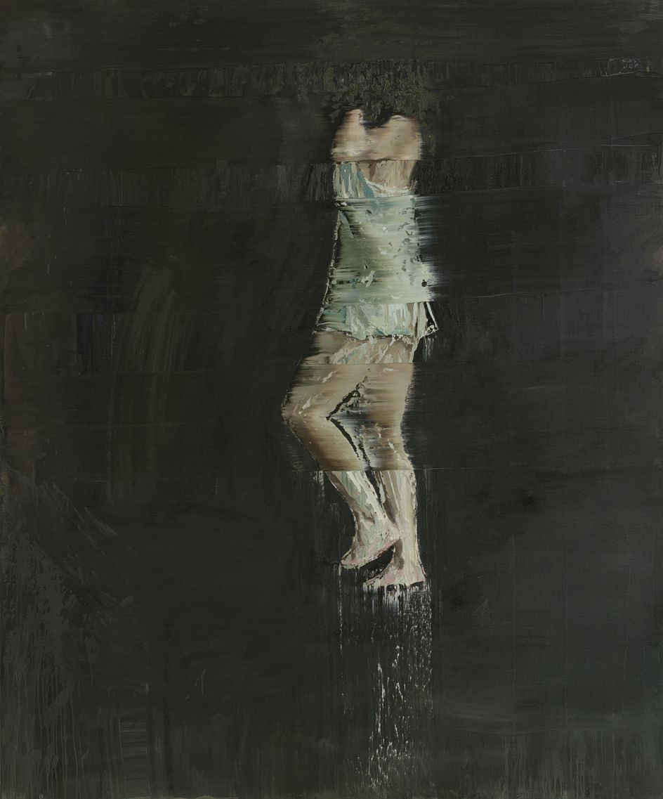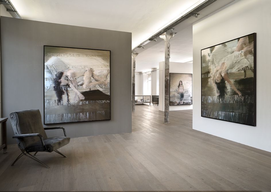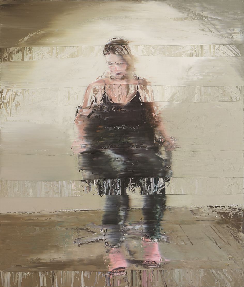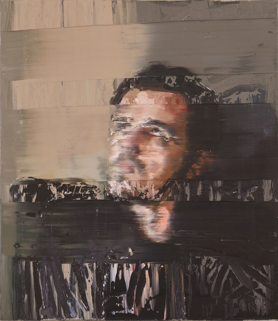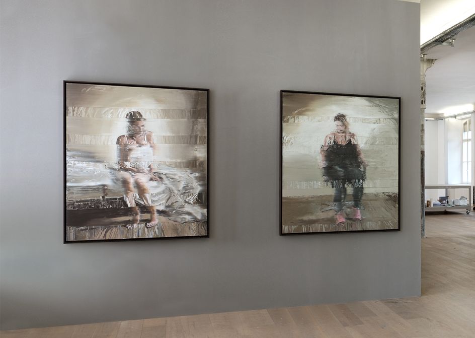 Like his previous work, he creates theatre-like settings using his personal photographs to assemble a collage, which he then paints on canvas alla prima with multiple layers of impasto oil paint. Before the surface dries, he pulls the paint with a spatula or a palette knife to reveal a distorted image, frozen in time, between abstraction and figuration.