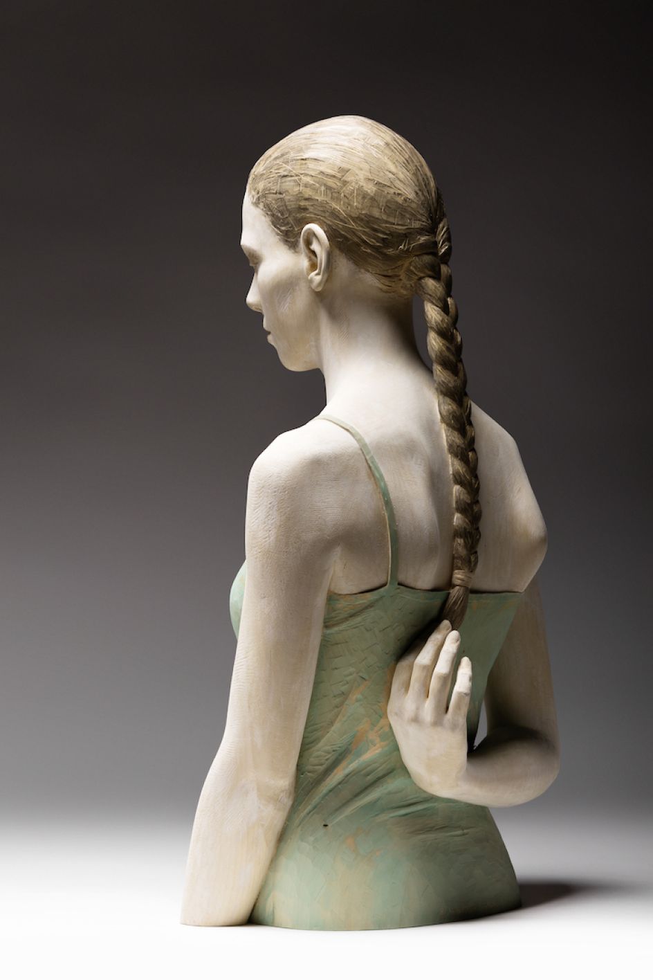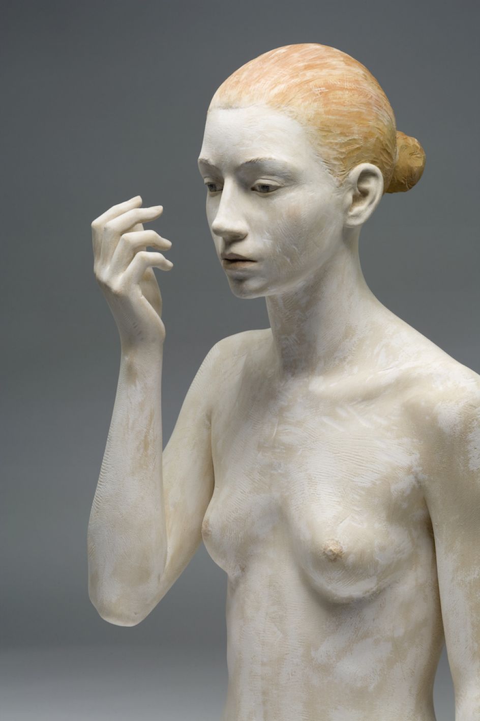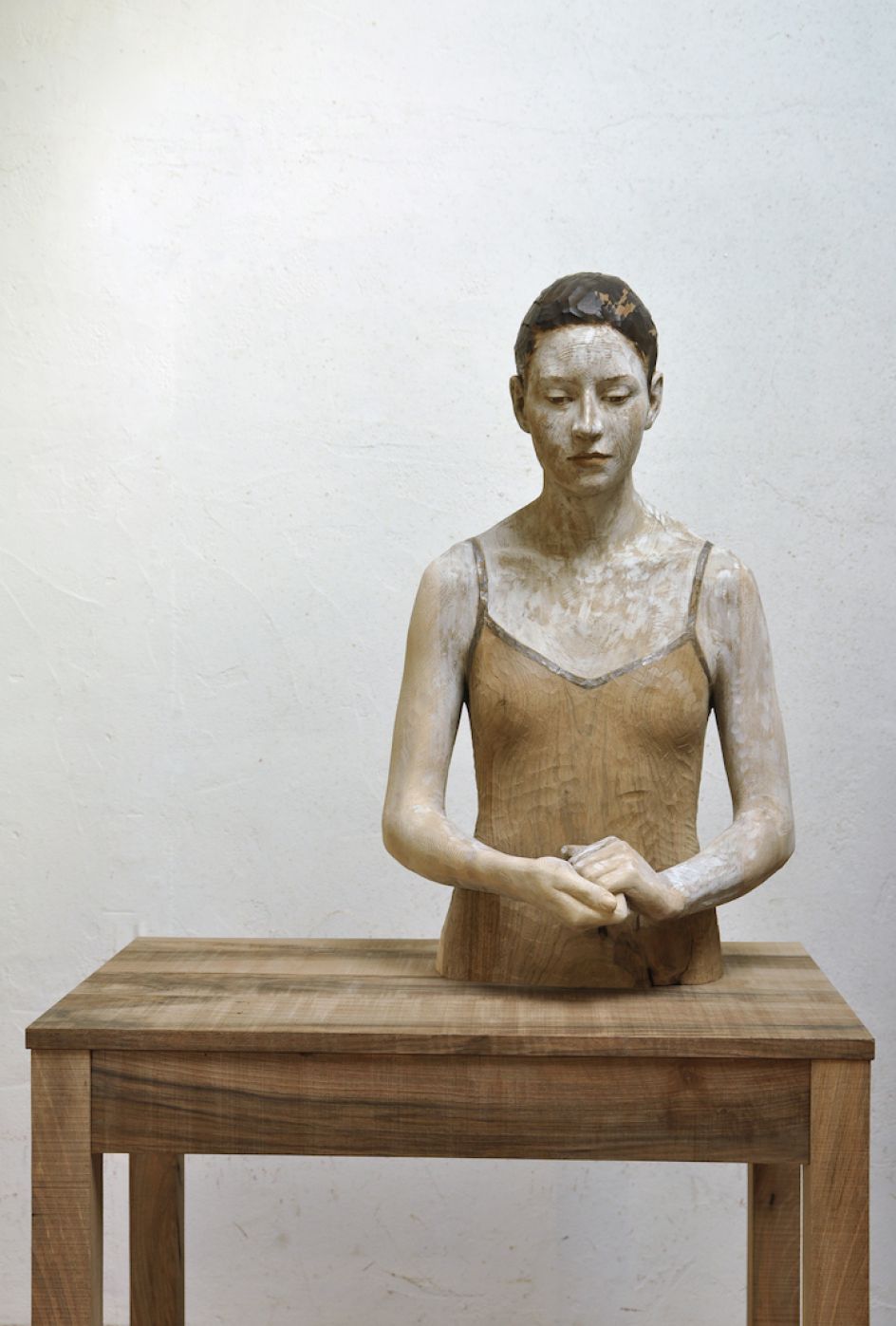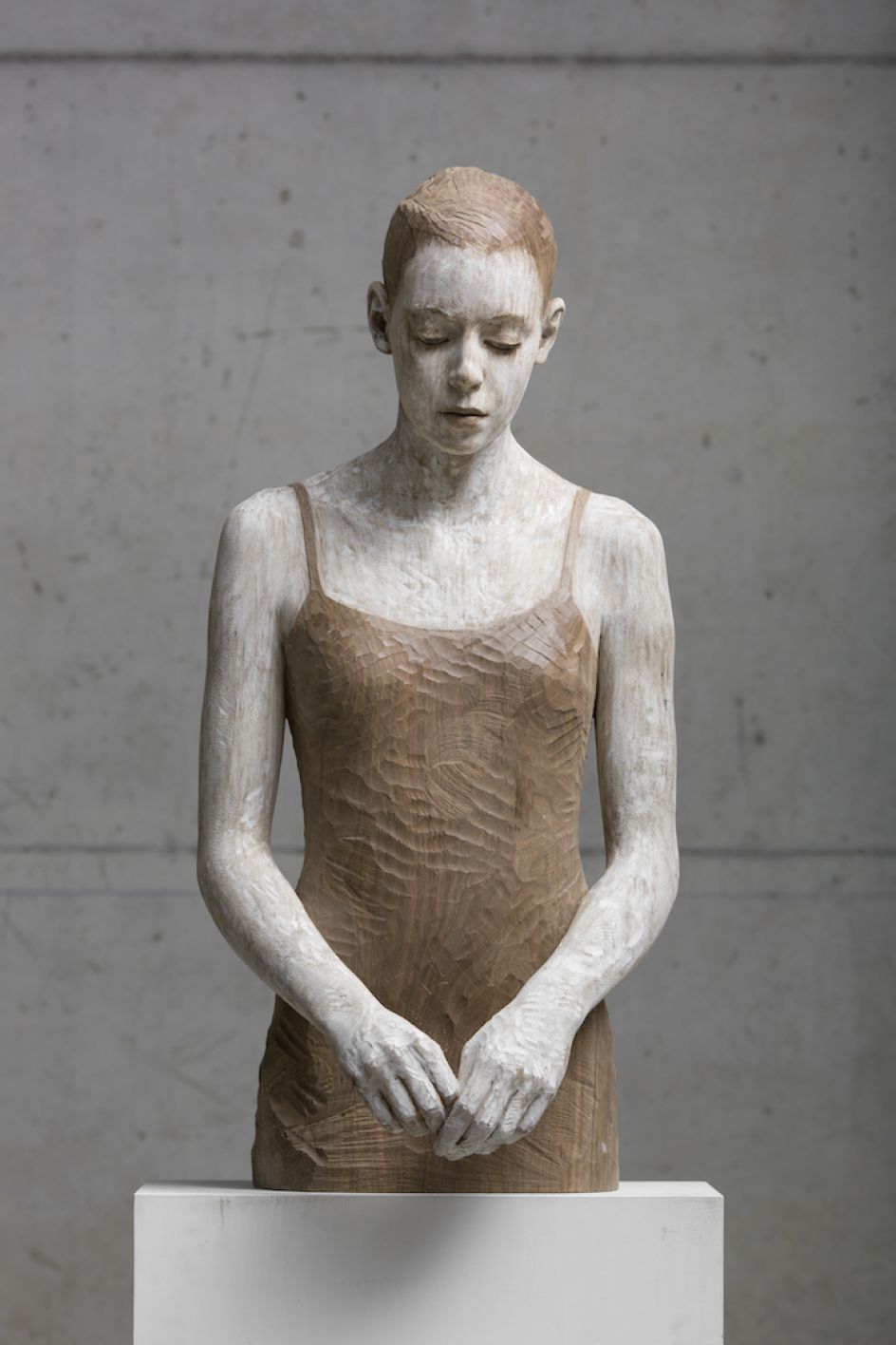 It is for this reason that Walpoth uses semi-translucent paint to coat his works, ensuring that the wood grains stay visible. Each sculpture offers a serene view on humanity, as all of the figures seem to be pensive and lost in thought.