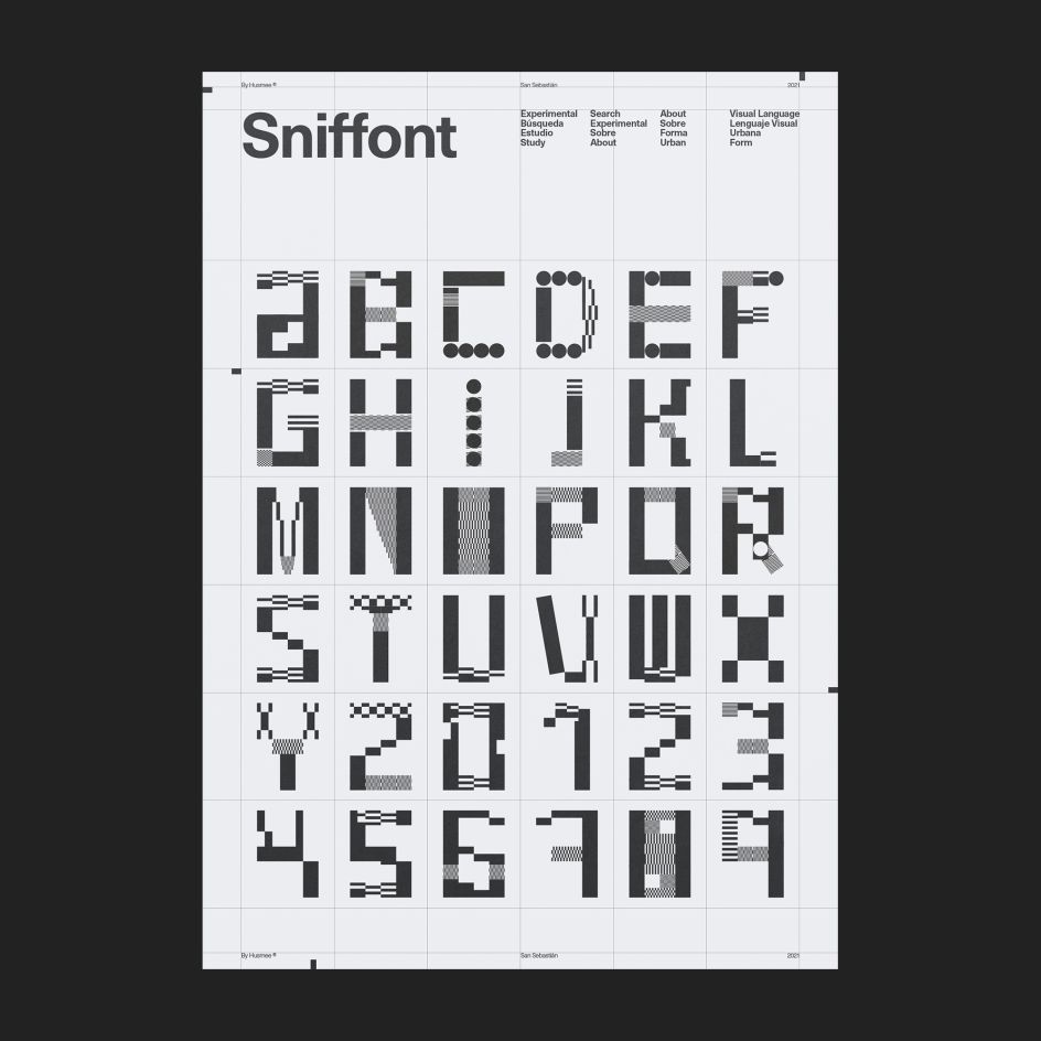"It all starts with observing and searching," Alain says. The result is a printed publication, a series of posters and animations, plus a custom typeface named Sniffont. Additionally, the studio devised its own Snifform Grid, which is based on the building El Kursaal, designed by architect Rafael Moneo and based in San Sebastián.