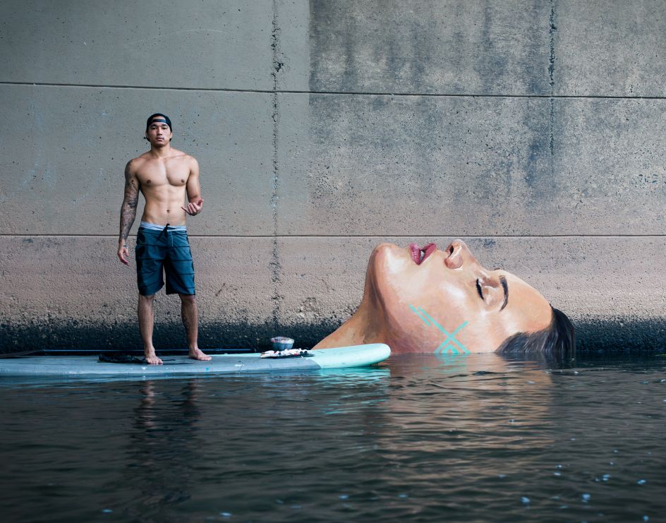 Otherwise known as Sean Yoro, he's an Hawaiian artist based in New York City and has a particular love of finding unusual spots where you wouldn't normally expect to discover art. In many cases, his acrylic artworks will rise out of water on the surface of hard-to-reach rusting sunken ships or forgotten concrete posts of bridges. How does he get there? Amazingly, he often uses his trusty surfboard, which he then balances on while he paints.