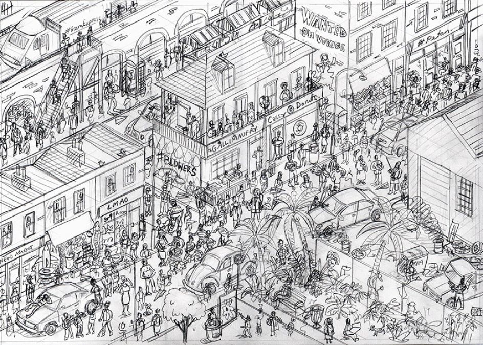 The guys at Creative Commission gave me a call to say Sony / Columbia records had posted a brief on their site, wanting a Where’s Wally style piece for a major artist. I hadn’t seen the brief at the time, but when they’d compared my profile with what Sony needed, we are perfect for each other. It just goes to show, so much of an illustrators work is about right brief, right time. That’s why you have to cast the net wide.