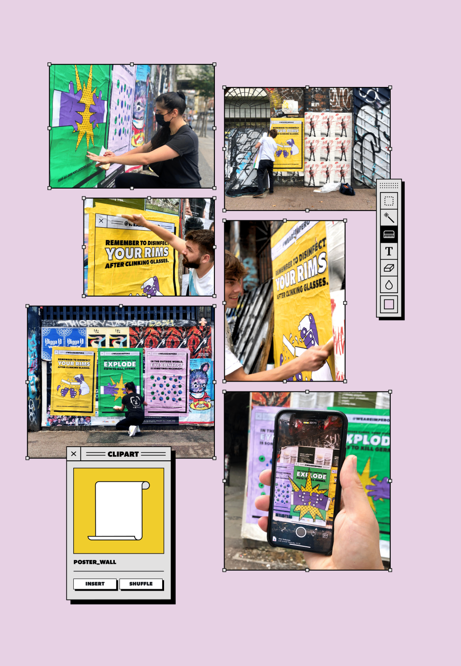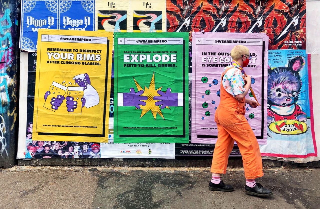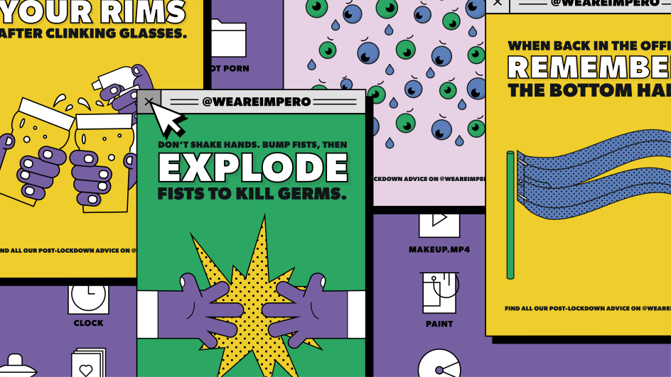 Asking members of its team to share their experiences and concerns about the post-lockdown world as they started to go back outside, it chose eight snippets of advice to illustrate and turn into lighthearted posters and animations. "Remember to disinfect your rims after clinking glasses," was one nugget of wisdom, while another reads: "Don't shake hands, bump fists, then explode fists to kill germs!"