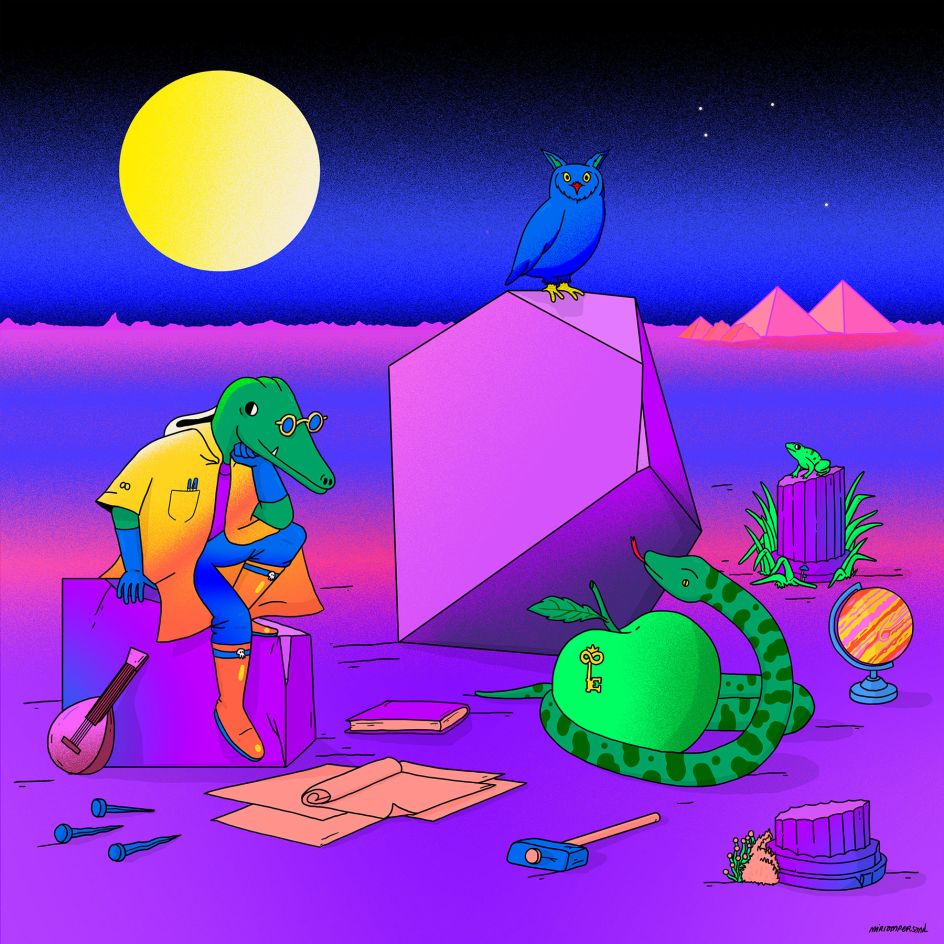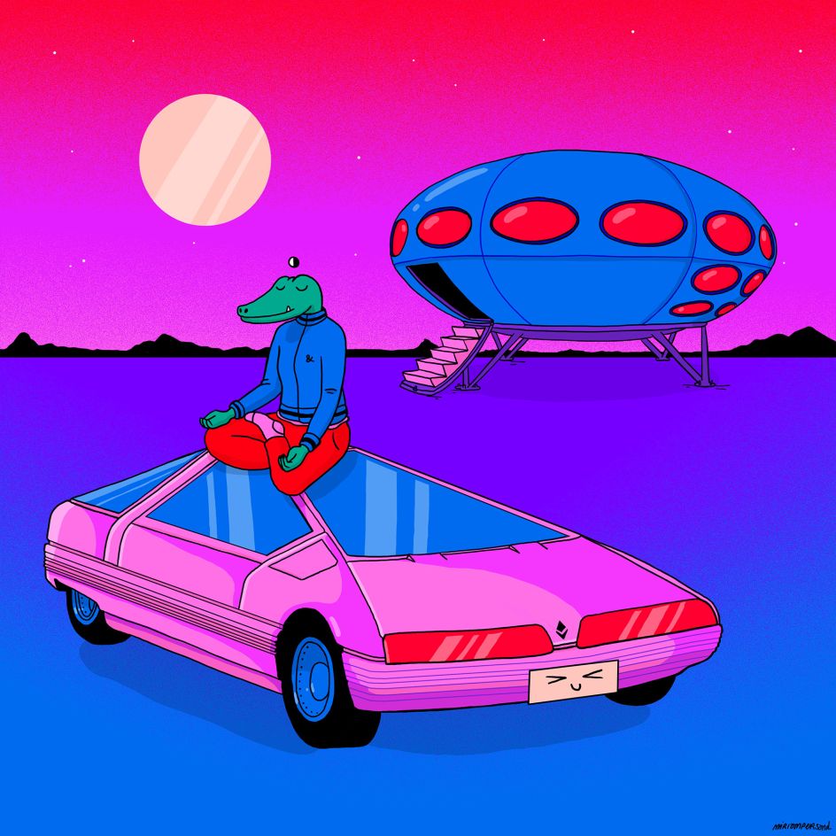 Miriam's pieces are a mesmerising blend of surrealism, psychedelia and a touch of whimsical nonsense. Futuro stands out as an example, featuring an alligator in a meditative stance beside futuristic cars and houses.