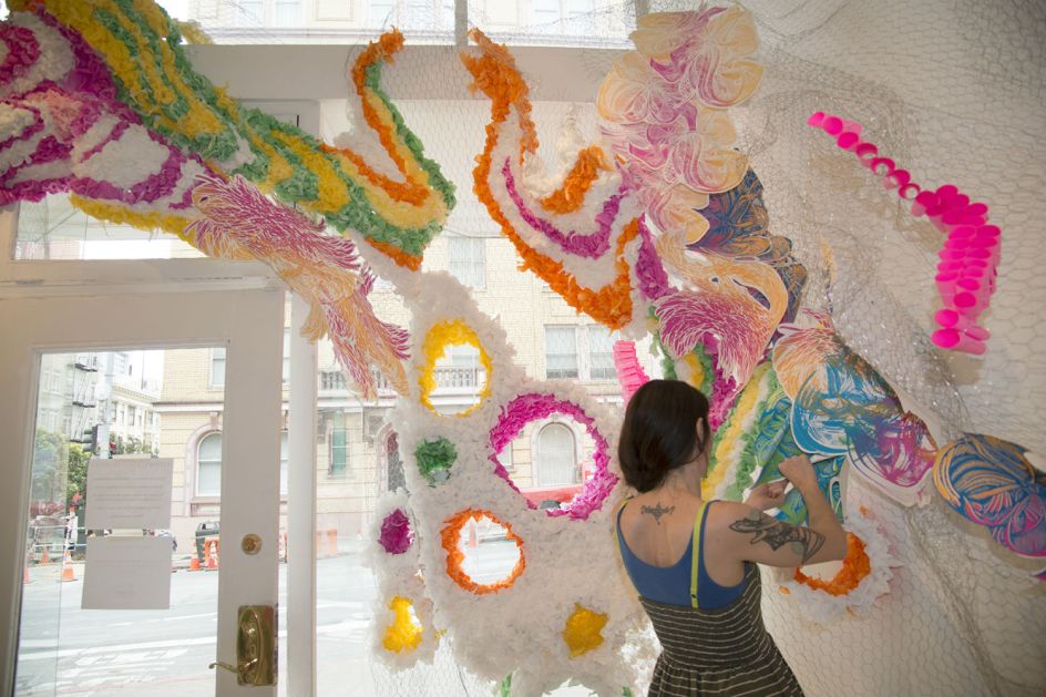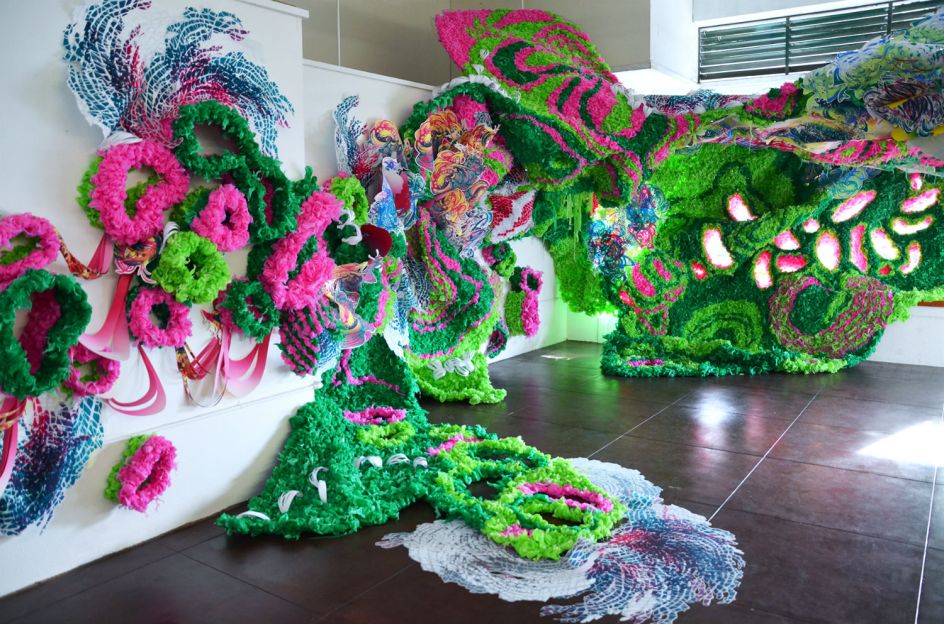 Originally trained as a printmaker, American artist Crystal Wager translates her organic and biomorphic designs into sprawling site-specific installations and colourful, bursting sculptures. Wagner’s process largely begins with a single mark, which she expands upon, developing new and consecutive shapes that seemingly multiply as they emerge.