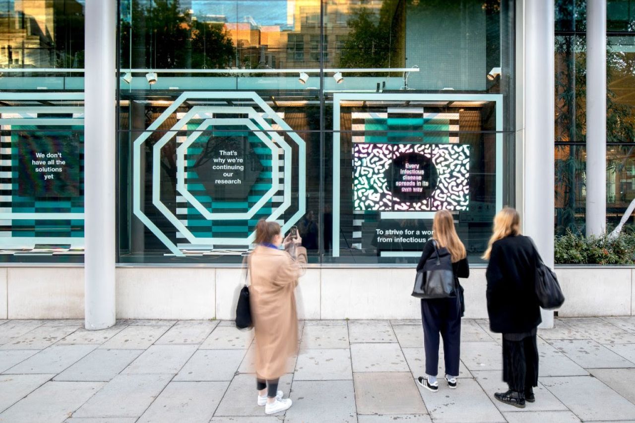 Inspired by the microscopic structure of bacteria and viruses, the patterns in which they spread infection, and the work of Wellcome in the fight against it, the displays incorporate 3D shapes, optical effects, bold designs and mesmerising animation.
