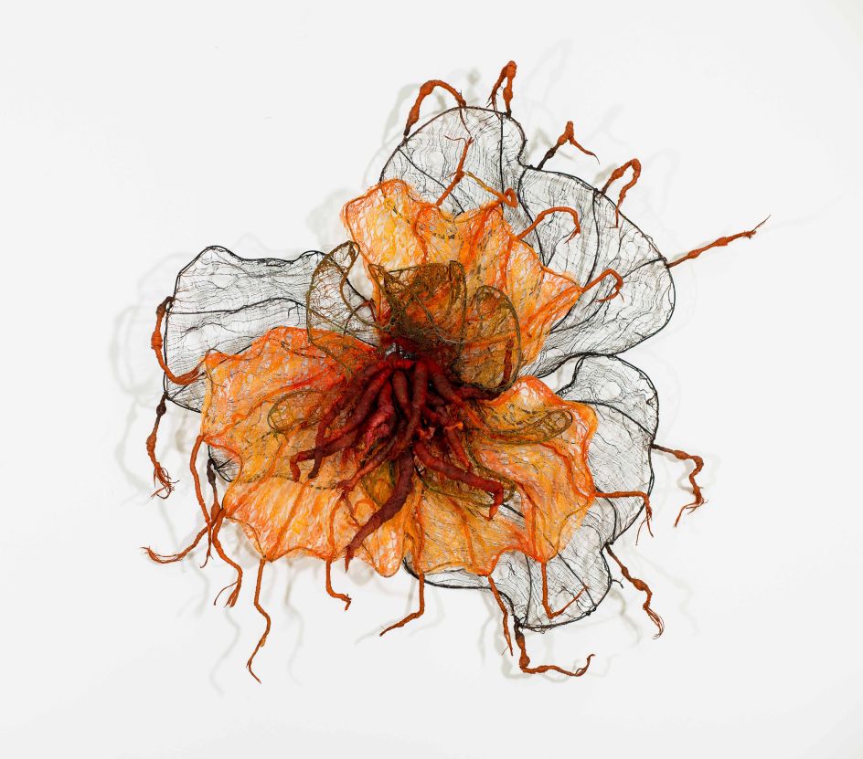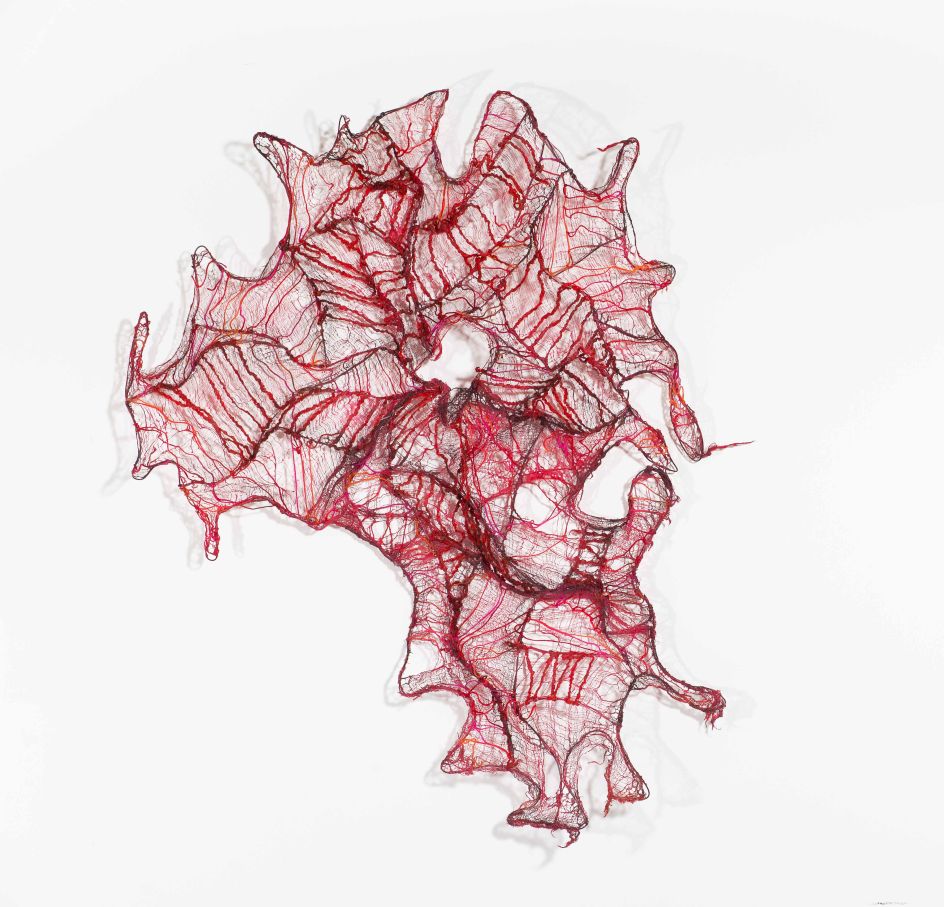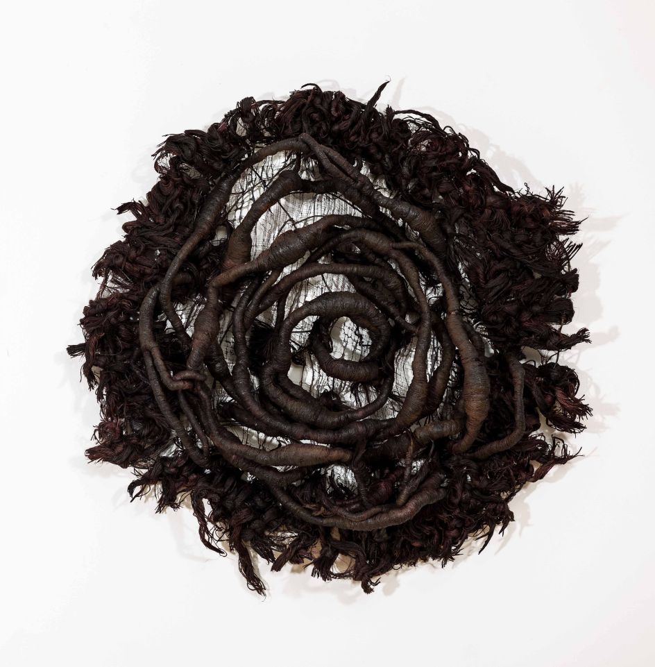 "Okore’s practice explores these subjects of ephemerality and transformation. Her intricate works contain rich textures and reveal extraordinary manifestations of colour and formations... Each visceral sculpture is created through various repetitive and labor-intensive techniques, like teasing, twisting, dyeing, and sewing, applied to natural materials such as cheesecloth, burlap, and paper, which only serve to further accentuate these natural elements."