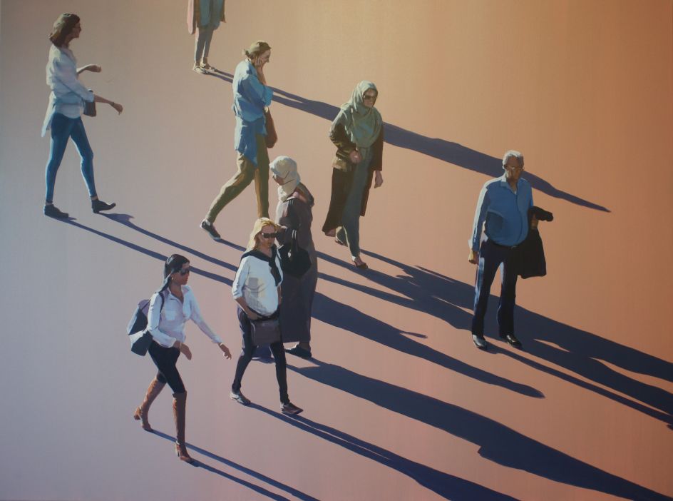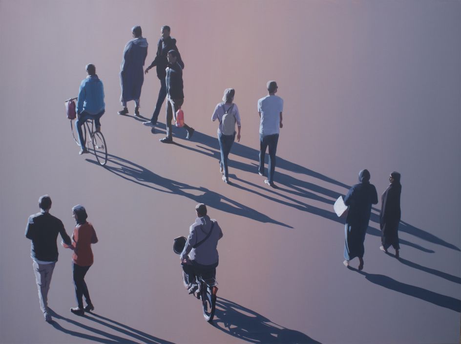 Heavily influencing this body of work is Sam’s recent trip to Marrakech. As with his earlier works, Sam’s process is informed by his photographs of people in their respective urban environments. The experience led to him incorporating warmer colours in comparison to previous works, and with more information about the people pictured. "I often paint over old works and the glimpses of previous layers create the exciting sense of another level of experience to the moment represented," he adds. "Inward Sky was informed by photographs taken in Morocco in January and take a different approach altogether. The first marks are definitive and need to be made with great care."