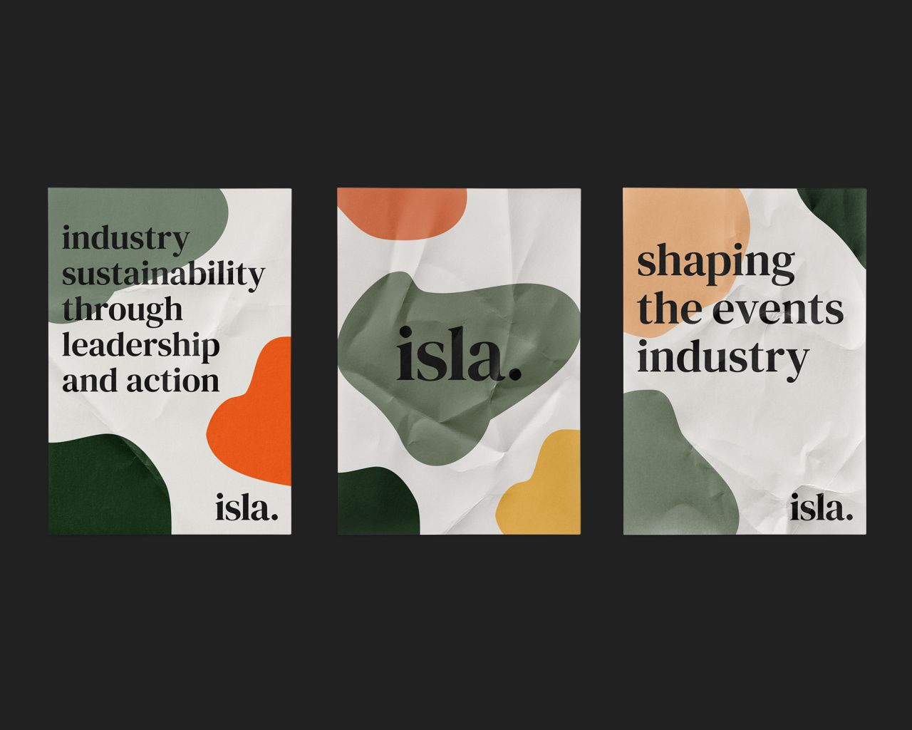 The brand and website are centred around those exact values. The organic brand shapes are enigmatic of isla shaping the event industry, and their contribution to a more circular economy. The core earthy colour palette oozes sustainability but is injected with strong vibrant accent colours to give the electric vibe of the events industry.