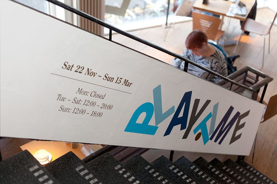 Using the exhibition title Playtime to form the main part of the identity, the word-mark is a structure that changes to suit different media or location and is made up of nine elements, that neatly relates to the nine artists in the exhibition.