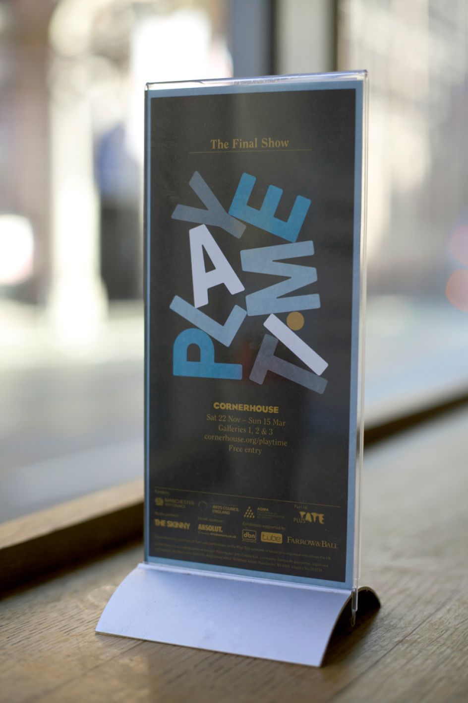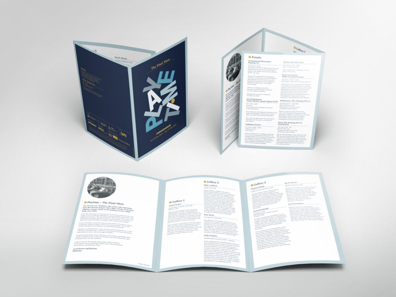 The colour palette was inspired by the film; Playtime, and the supporting typeface adds a commemorative feel. The branding was rolled out across the gallery guide, posters, window vinyl, gallery vinyl, invites and flyers.