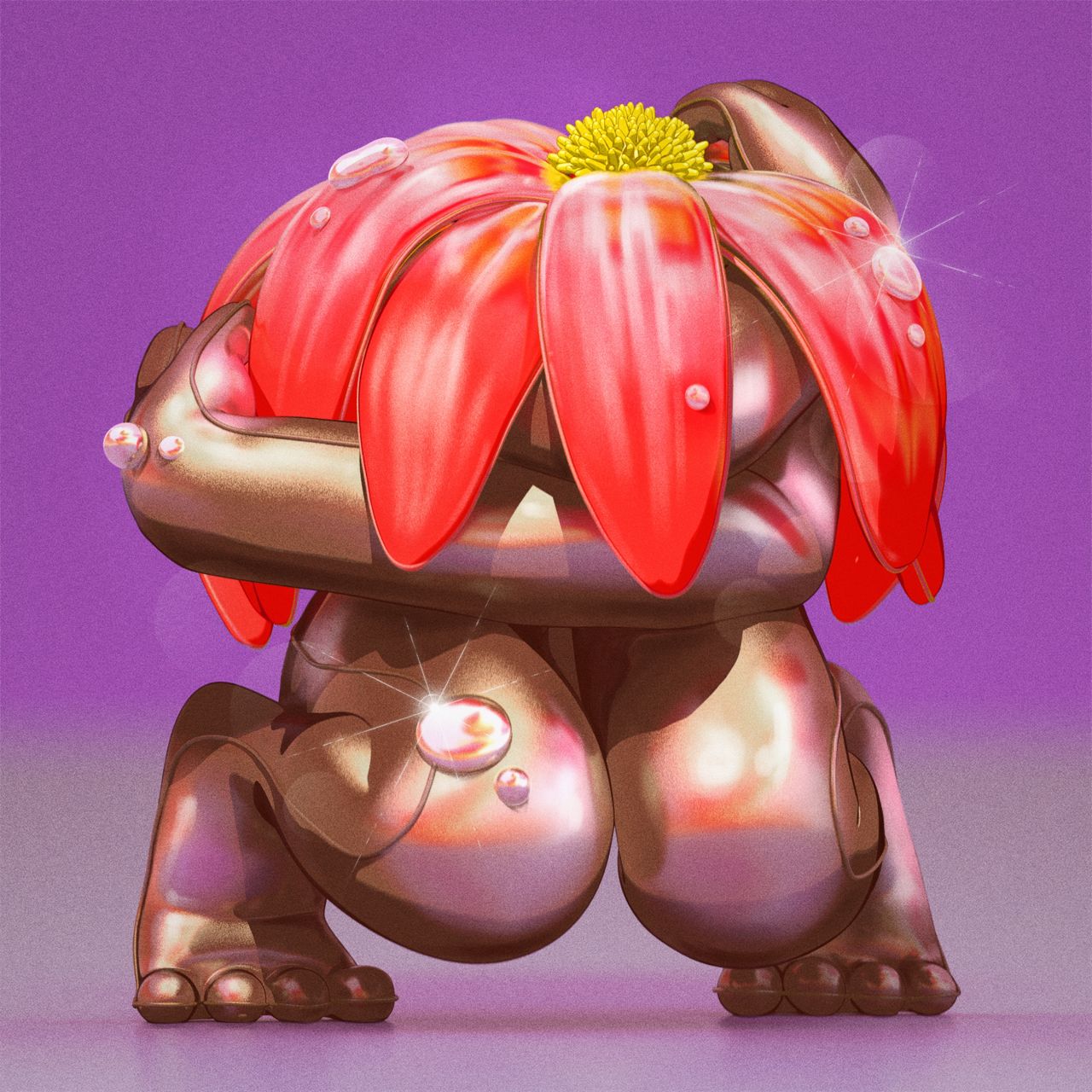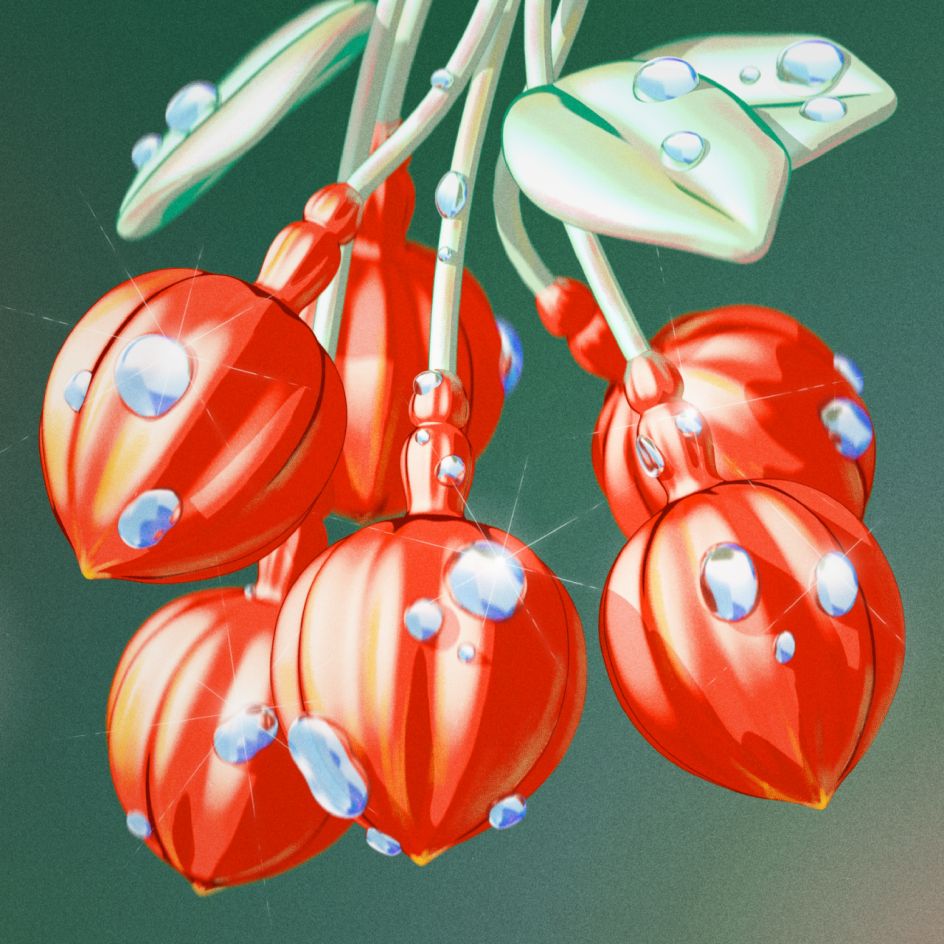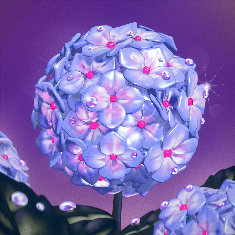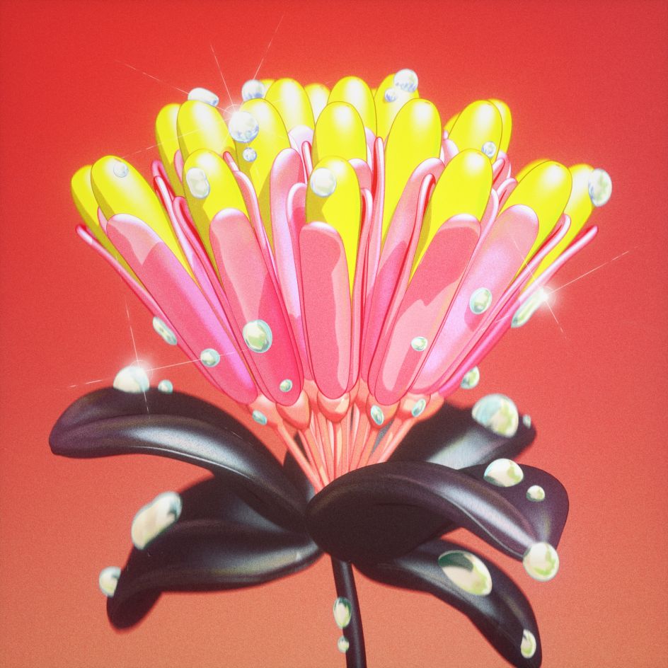 The result of these explorations is the dreamy, chrome-like illustrations of dew-flecked flowers and strange figures sprouting giant petals. With an almost metallic finish and swelling, inflated mass, these unusual images are simultaneously mysterious, captivating, and uniquely Jaenam.