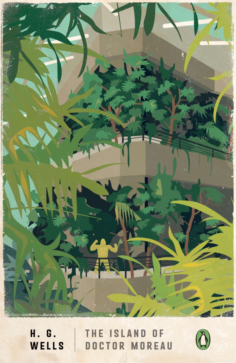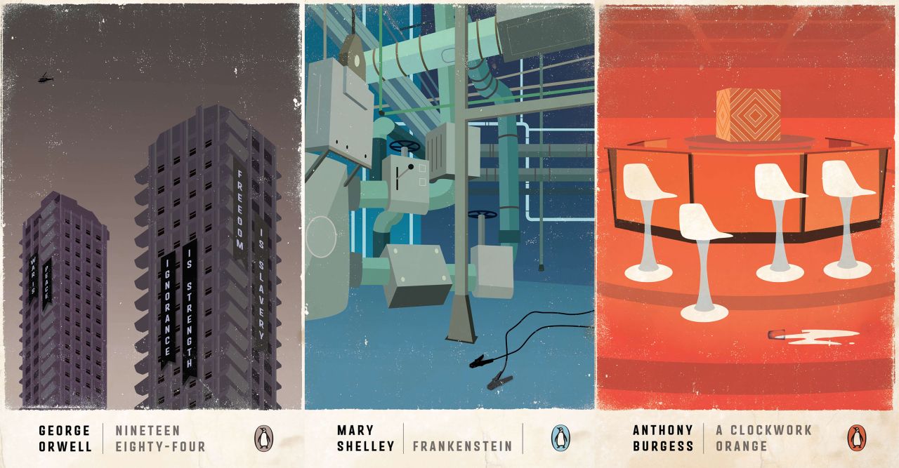The cover for 1984 features the iconic Barbican Towers draped with banners bearing slogans from the novel; the cover for A Clockwork Orange re-imagines the Barbican Martini Bar as the Korova Milk Bar; the cover for The Island of Doctor Moreau pictures the Barbican Conservatory inhabited by Dr Moreau’s monsters; and the cover illustration for Frankenstein unveils the ‘engine room’ deep below the Barbican Centre as Frankenstein’s lab.