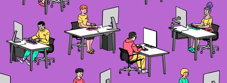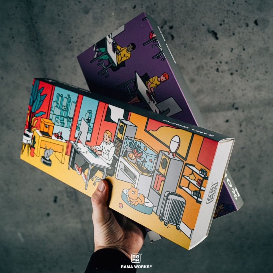"Fast forward to spring this year, and the people at RAMA approached me again with a creative brief: this time around it was an illustration that would adorn the packaging of their soon-to-be-launched new keyboard, KARA. Again the brief was pretty open: the only requisite being that the keyboard itself would be featured in the illustration. I ended up drawing two different scenes, one with a single character hacking away on the keyboard in a fun and colourful room and another one which showed a scene of several characters working on their computers while using the KARA."